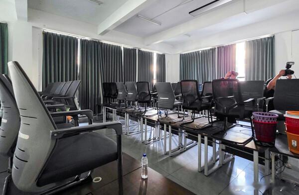 图:图为16日,在柬埔寨茶胶省(Takeo)电信诈骗园区内部,可以看到疑似被犯罪组织使用过的椅子和桌子仍留在现场。【摄影:李永根 记者】