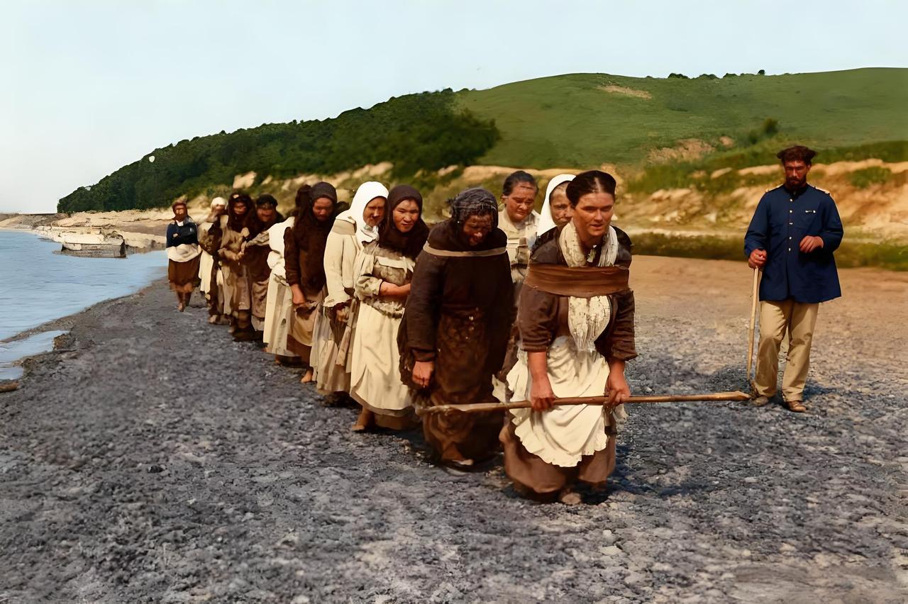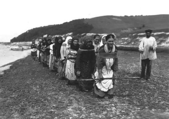 这张摄于1900年的老照片,将沙俄统治时期乌克兰底层女性的生存困境,定格在伏尔加河畔的一段纤绳上——画面里,几名女性躬身拖拽着河中的木船,身后站着一名男子,以监督者的姿态,将阶级与性别的双重压迫,刻进了浑浊的河风里。 1900年的沙俄女性(尤其是底层女性)几乎没有政治权利、受教育权利与经济独立权。根据当时的《沙俄民法典》,已婚女性的财产需由丈夫支配,未婚女性需依附父亲或兄长,若家庭贫困,女性常被 “出租” 或强制参与重体力劳动以换取家庭生存资源 —— 拖船、田间耕作、纺织厂苦工是当时底层女性最主要的三种劳动形式。 据沙俄帝国1897年人口普查与 1900 年《伏尔加河航运报告》记载,当时伏尔加河中下游(包括乌克兰东北部沿岸)的纤夫中,女性占比约 35%,主要来自失去土地的农民家庭。她们的日薪仅为男性纤夫的1/2甚至1/3,且需承担更长的劳动时间(每天10-12 小时),监督者多为航运公司雇佣的 “工头” 或地主指派的管家,有权对 “怠工” 者实施鞭打、克扣口粮等惩罚。