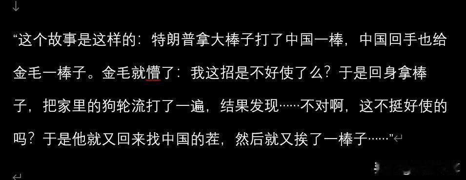 关于特朗普挥舞关税大棒屡战屡败却依然死性不改这件事,我看到一个段子,给大家分享一下。虽然是段子,但确实完美的诠释了中美贸易摩擦中,特朗普的心态。事实也是如此,特朗普挥舞关税大棒,将盟友、仆从国都打了一个人仰马翻,对方纷纷跪甜求饶。所以,他认为关税大棒应该是战无不胜的。但他恰恰忽略了一个问题,“打狗棒”只能打狗,遇到跟美国一样强大的人,打狗棒就失去抓瞎了。相反,我们手里有更厉害的“打狗棒”,还能狠狠反击回去,打得他一头的包!