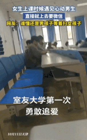天津,一女生在大学课堂上课时,突然发现隔壁桌的男生符合自己的心理形象,在室友鼓励下,竟然直接上去要微信,男生当场就蒙了,脸红的不行,但还是掏出手机同意添加。网友:我当年要是有这个这个勇气也不至于现在还单身 发现目标后,女生轻轻碰了碰身边的室友,声音压得极低:你看那个男生,好像我喜欢的类型。室友顺着她的视线望过去,眼睛一亮,凑近她耳边说,喜欢就上啊,待会老师来了,下课他走了,你后悔都来不及。 教室里人来人往,有点嘈杂。她犹豫了一下,深呼吸,突然站了起来。一步步轻轻绕到那男生旁边,伸手碰了碰他的肩膀。 男生回过头,眼神有点懵,像在问:怎么了?她稳住声音,尽量自然地说:同学你好,我觉得你挺有眼缘的,可以加个微信吗? 周围有同学注意到了,笑声轻轻响起。男生愣了一下,耳朵一下子红了。但他没拒绝,低头掏出手机,两人就这样加上了好友 这事被人发到网上,不少人留言说:真佩服这姑娘,我当年要是也有这种勇气,现在也不至于还单身。 其实挺多人在青春里都有过这样的瞬间,远远看见一个人,心里动了一下,却始终没敢上前。怕被拒绝,怕尴尬,更怕那一点点心动最后落得一场空。但这姑娘不一样,她在心动发生的瞬间,选择了行动。不是莽撞,而是一种真诚的尝试 青春里的好感,有时候不需要太多理由,也不需要漫长铺垫。一次眼神的交汇,一次勇敢的上前,也许就是一个故事的开始。 我们常说,现在的人越来越不敢爱了,怕受伤,怕没结果。可有时候,爱情恰恰是从那一点点冲动开始的。没有勇气开口,再多的可能也成了不可能。 当然,不是鼓励所有人都莽撞去表白,尊重对方意愿、注意场合是基本,有多少人现在后悔当初没有主动一些错过了很多啊