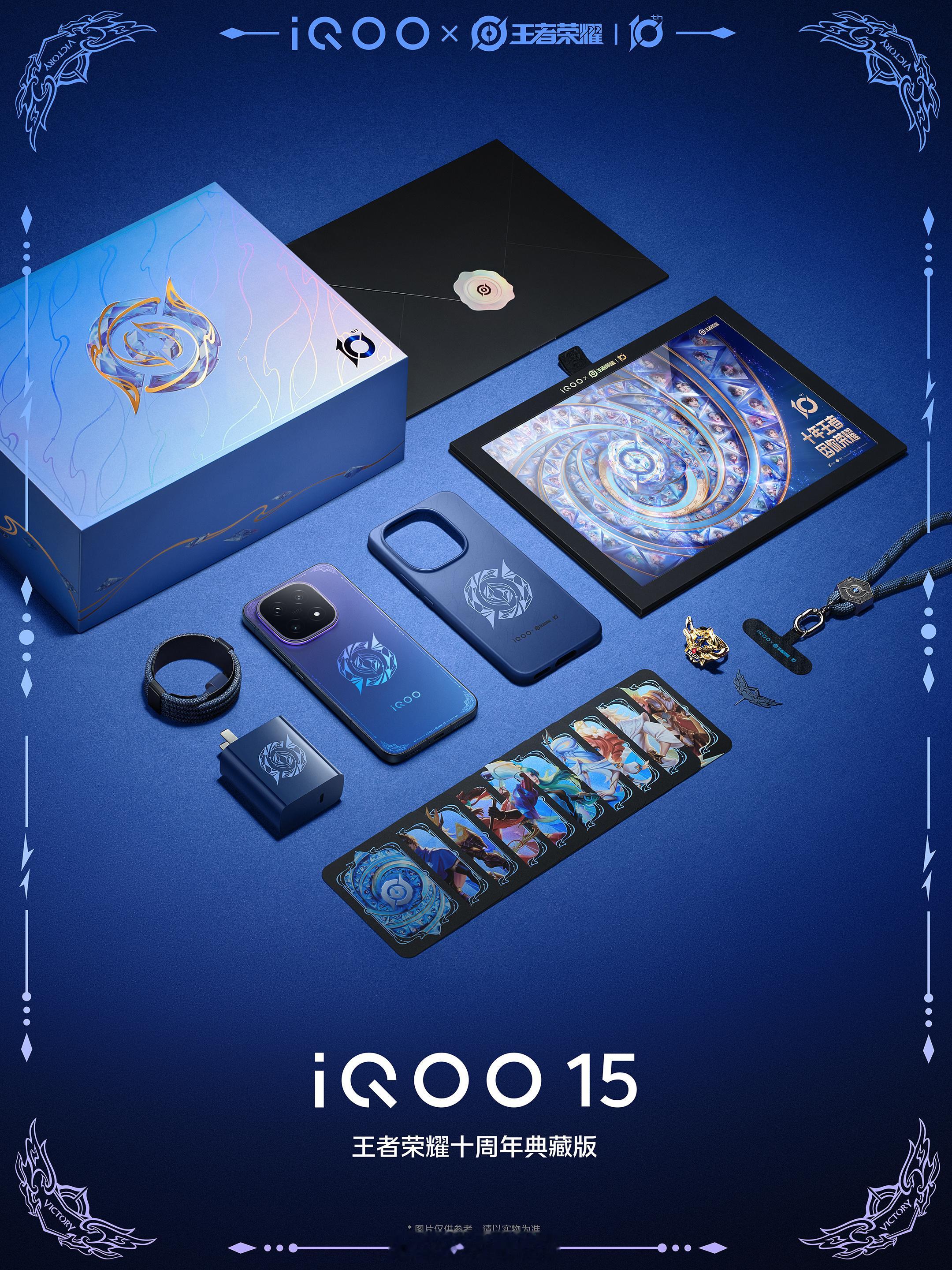 iQOO 15 还有一款 iQOO × 王者荣耀十周年典藏版礼盒,JDG 无畏代言。这个配色挺少见,礼盒内容很丰富,定制配件可以称得上是收藏级周边了。