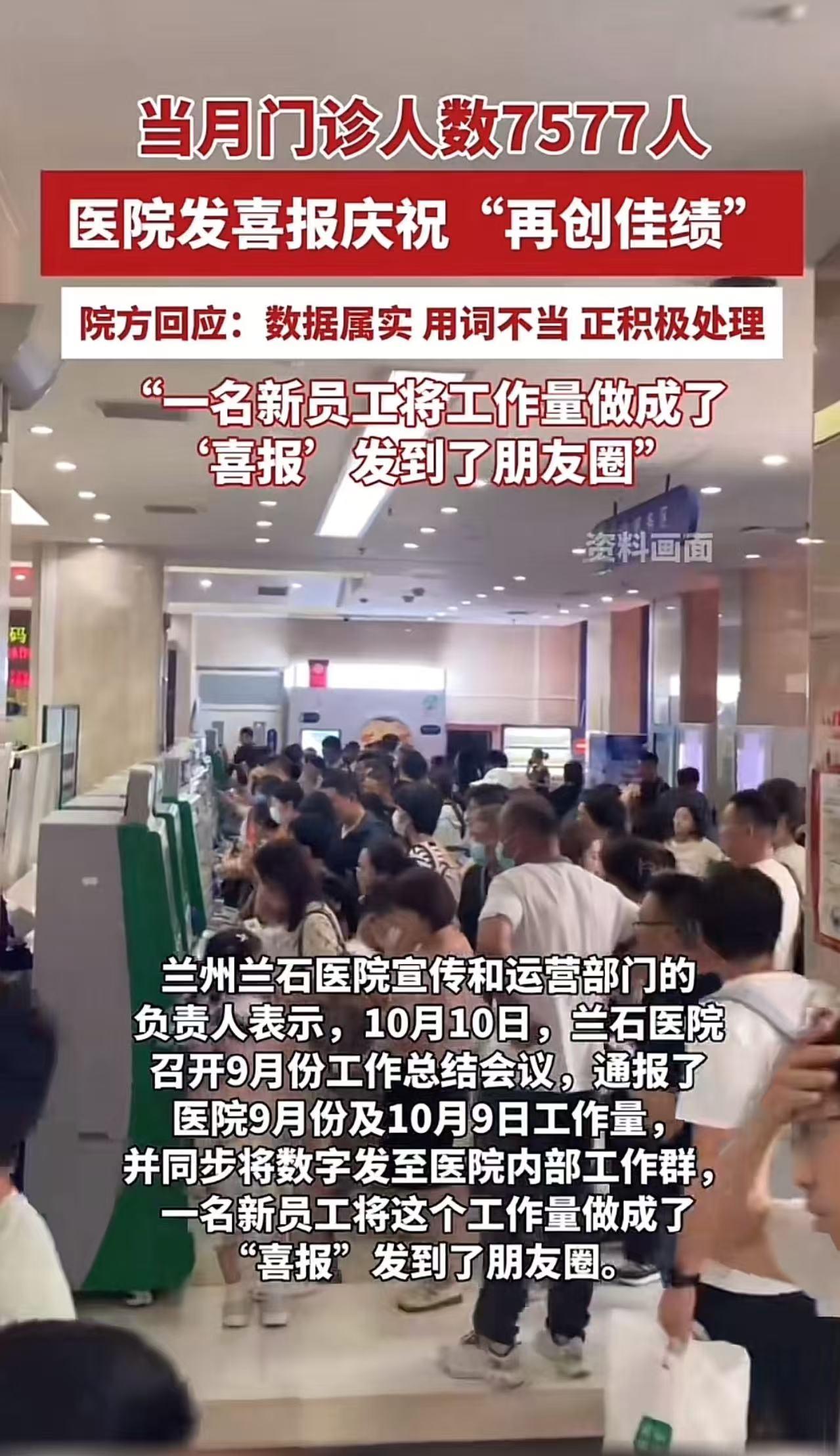 “极度引人不适!”甘肃兰州,当月门诊人数7577人,医院发喜报庆祝“再创佳绩”!网友炸锅,医院是救死扶伤的地方,怎么能当成一门生意?这不是盼着病人“下次光临”吗?院方回应:新员工将用词不当,把这个工作量做成了“喜报”发到了朋友圈。 这几天,一张出自兰州兰石医院的“喜报”,就像一颗投入平静湖面的巨石,激起了网友们满腔的愤怒。大家看了之后,非但没有感受到一丝欢喜,反而气愤不已。 仔细瞧瞧这喜报上的内容,简直让人瞠目结舌:“热烈祝贺兰石医院再创佳绩,九月份门诊诊疗人数7577人,住院及门诊手术台数426台。十月份开诊第一天,门诊人数451人,手术台数25台……” 这些数据,对医院来说,意味着收入的大幅增长,医护人员的工资和奖金也能水涨船高,医院上下自然是皆大欢喜。 可是,对于广大老百姓而言,这喜报却像一把把锋利的刀子,直直地刺痛了大家的心。 这哪里是什么佳绩啊,分明就是医院在盼着老百姓生病,好让他们有更多的“生意”可做。 这和古代医者“宁肯架上药生尘,但愿天下人无病”的高尚情怀相比,简直是天壤之别。 如今的医院,满眼似乎只剩下钱了,哪里还有半点救死扶伤的初心? 正因如此,网友们纷纷指责医院太缺德、没人性,这种把病人当“摇钱树”的行为实在是令人发指! 而医院负责人却解释说,10月10日,兰石医院召开9月份工作总结会议,通报了医院9月份及10月9日的工作量,并将数字发至医院内部工作群。结果一名新员工不懂分寸,把这个工作量做成了“喜报”发到了朋友圈,属于用词不当,目前正在积极处理。 但在我看来,这绝不是一句简单的“用词不当”就能搪塞过去的。医院本是生命的庇护所,是患者最后的希望。当医院开始用商业的思维来衡量业绩,用冰冷的数字来定义成功时,就已经背离了其存在的本质! 这种行为不仅伤害了患者的感情,更破坏了医患之间的信任。如果医院只盯着经济效益,而忽视了社会效益和人文关怀,那最终失去的将是民心,是整个医疗行业的公信力。 长此以往,医患关系将更加紧张,社会的和谐稳定也将受到严重威胁。这绝不是危言耸听,而是我们必须正视的严峻现实!