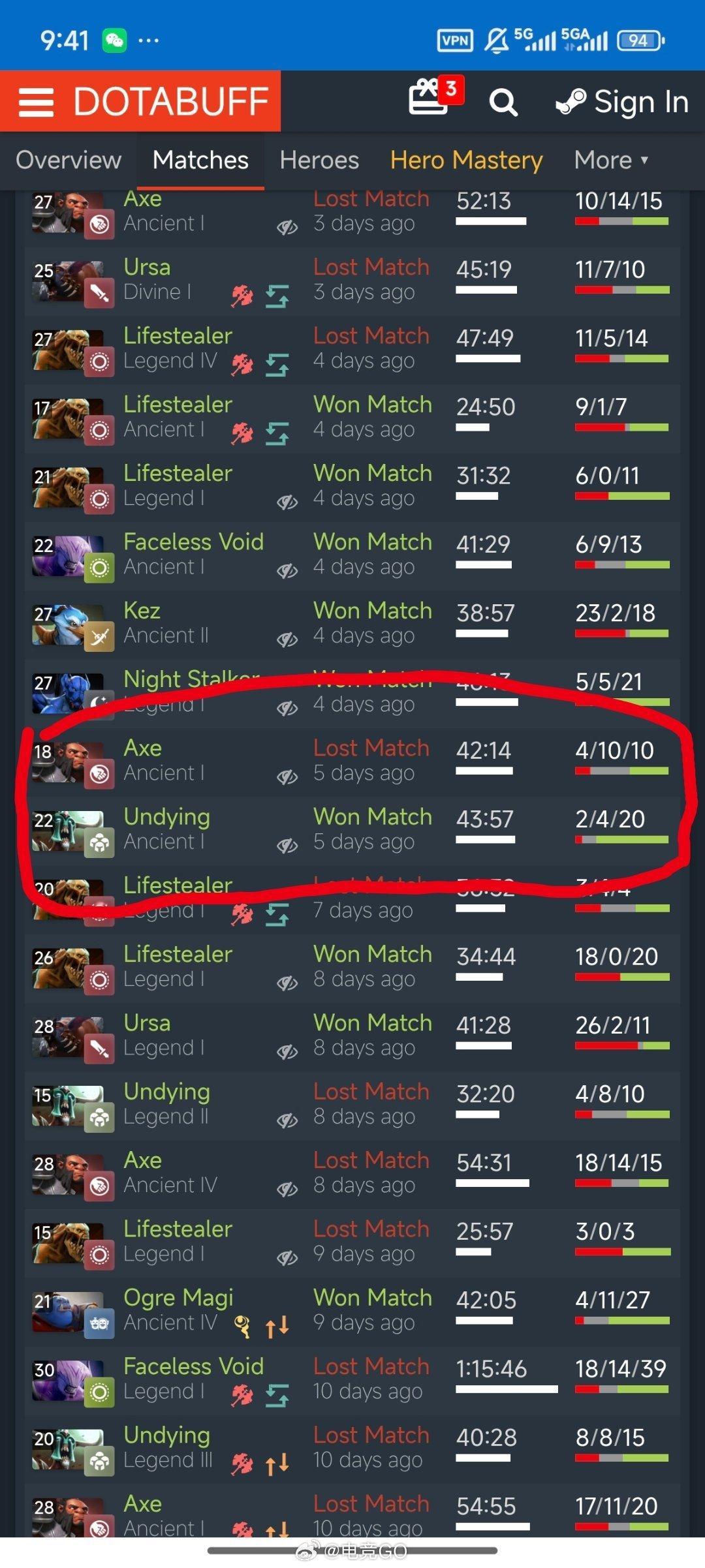 他第一局用的尸王,最终KDA为2/4/20,第二局的KDA为斧王4/10/10