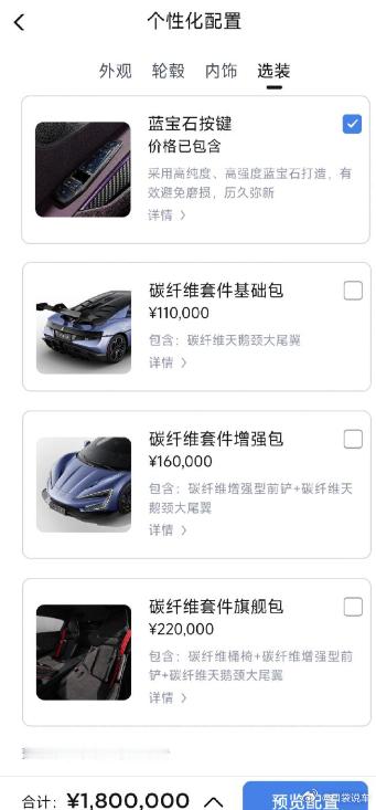 目前售价已上调至180万元,该价格已包含蓝宝石按键。此前,蓝宝石按键的选装价格为2.8万元。汽车资讯