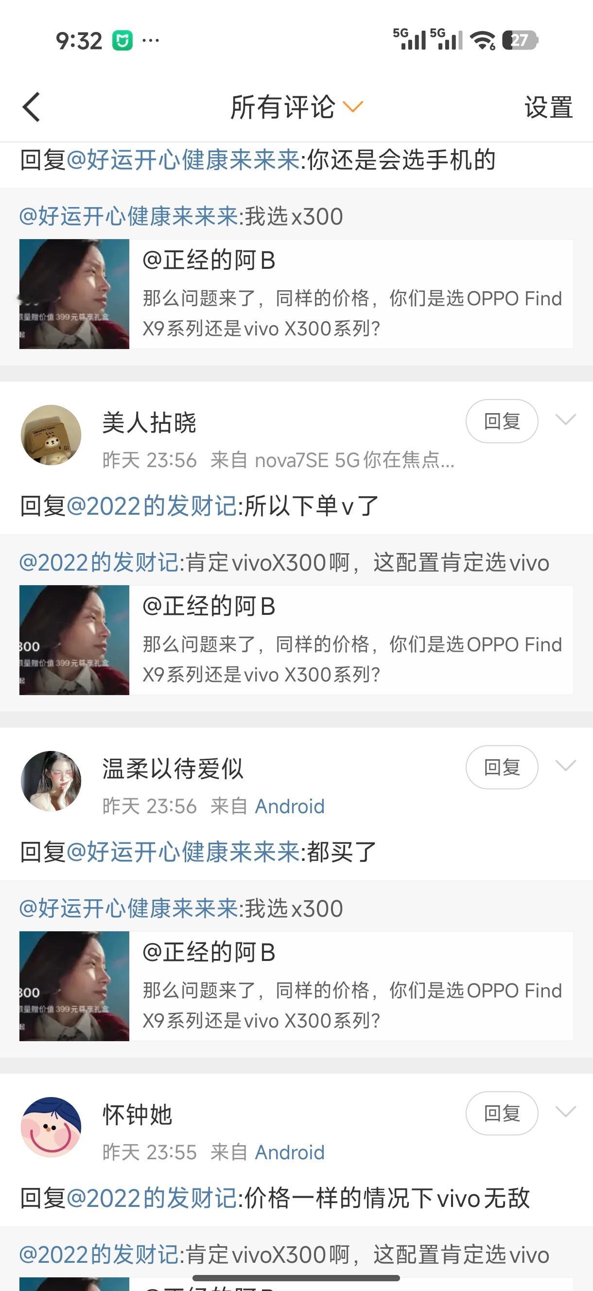 昨天问了一嘴OPPO Find X9系列和vivo X300系列价格一样哪个更值得买,评论区简直就是…大战[流鼻血][流鼻血]