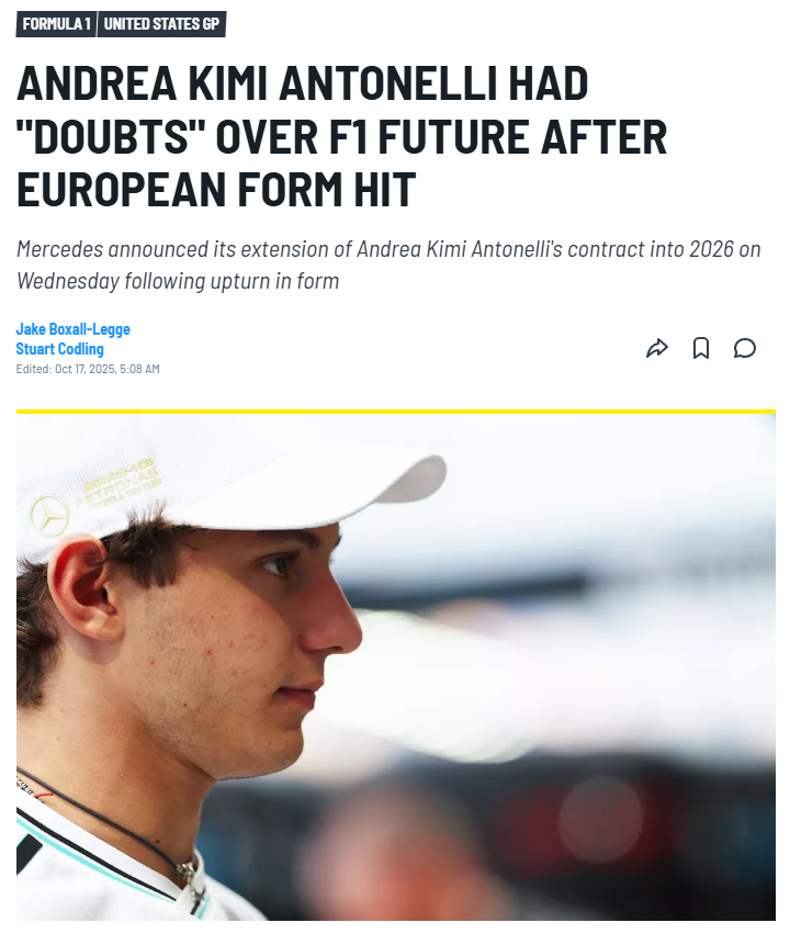 安东内利对于2026年之后的未来并不确定,但他感觉只要自己成绩达标,车队和他本人都有意续约至2027年。经过一年的历练,他非常清楚2026年绝不能再出现类似的状态滑坡。