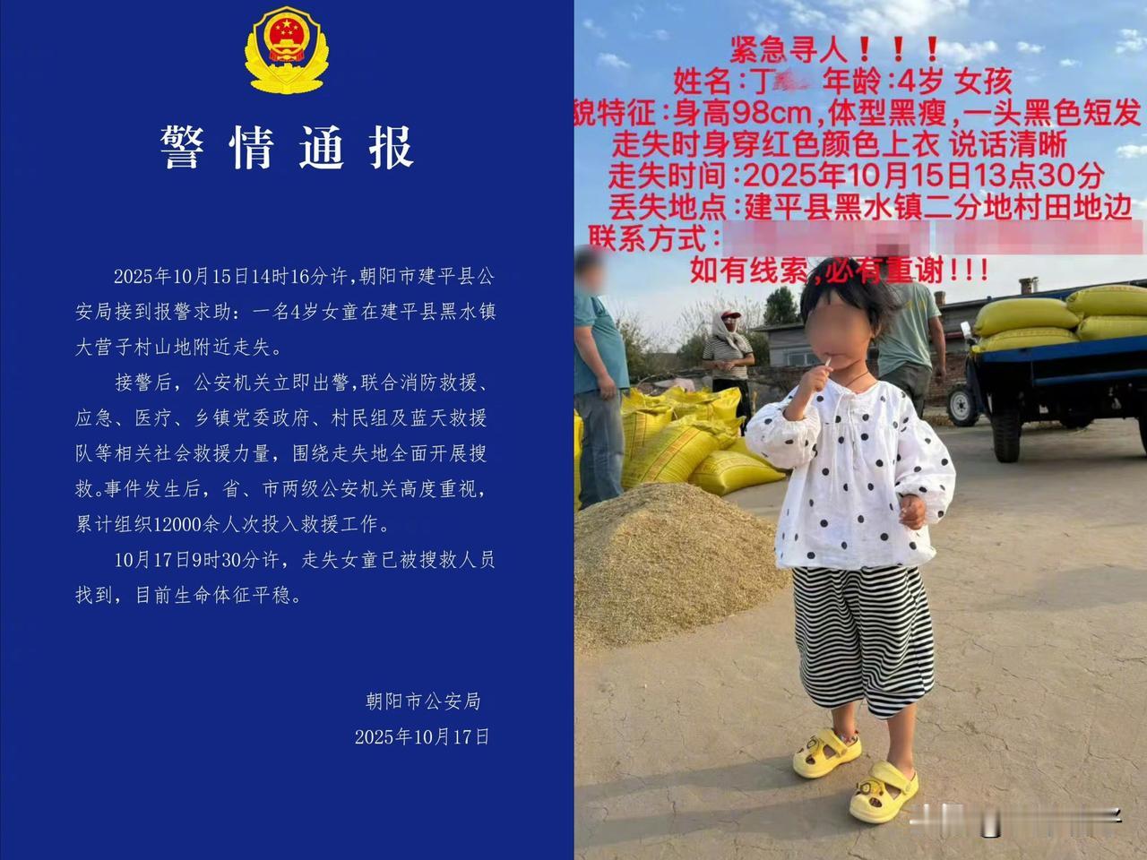辽宁朝阳4岁失联女童已平安找到!生命体征平稳,全网点赞救援力量! 此前牵动着万千网友心的辽宁朝阳建平县4岁失联女童,已于今日(17日)上午9时30分许被成功找到。经确认,孩子生命体征平稳,悬着的心终于可以放下了! 孩子失联到被平安找回,这短短的时间里,承载了一个家庭乃至全网的焦虑与祈祷。能在一个看似“不幸”的事件中,迎来这样一个“万幸”的结局,实在令人激动。这背后,是警方、救援队以及所有热心人士不眠不休、争分夺秒的努力。让我们为所有参与救援的英雄们点上一个大大的赞! 你们辛苦了! 孩子已经平安,这是最重要的。一个4岁的孩子已经具备了一定的表达能力,相信她能够为查明失联原因提供关键信息——究竟是孩子自己好奇走远,还是另有隐情?我们期待官方给出详细的调查结果,让事件真相大白。在此也呼吁大家不传谣、不信谣,一切以官方通报为准。 孩子天性活泼好动,对危险缺乏认知,家长就是他们最坚实的保护伞。带娃出门在外,“盯紧点” 绝不是一句空话,它意味着视线不能离开,意味着要牢牢牵住他们的小手,意味着在人多处要让他们始终在自己的可控范围内。孩子小没安全意识,咱们当家长的多上点心,愿每一个孩子都能在周全的守护下,平安、快乐地成长!