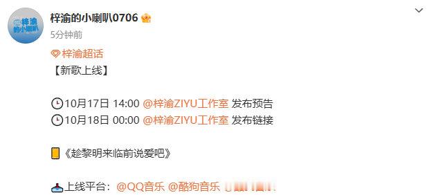 梓渝趁黎明来临前说爱吧发布节奏 梓渝又双叒出新歌了