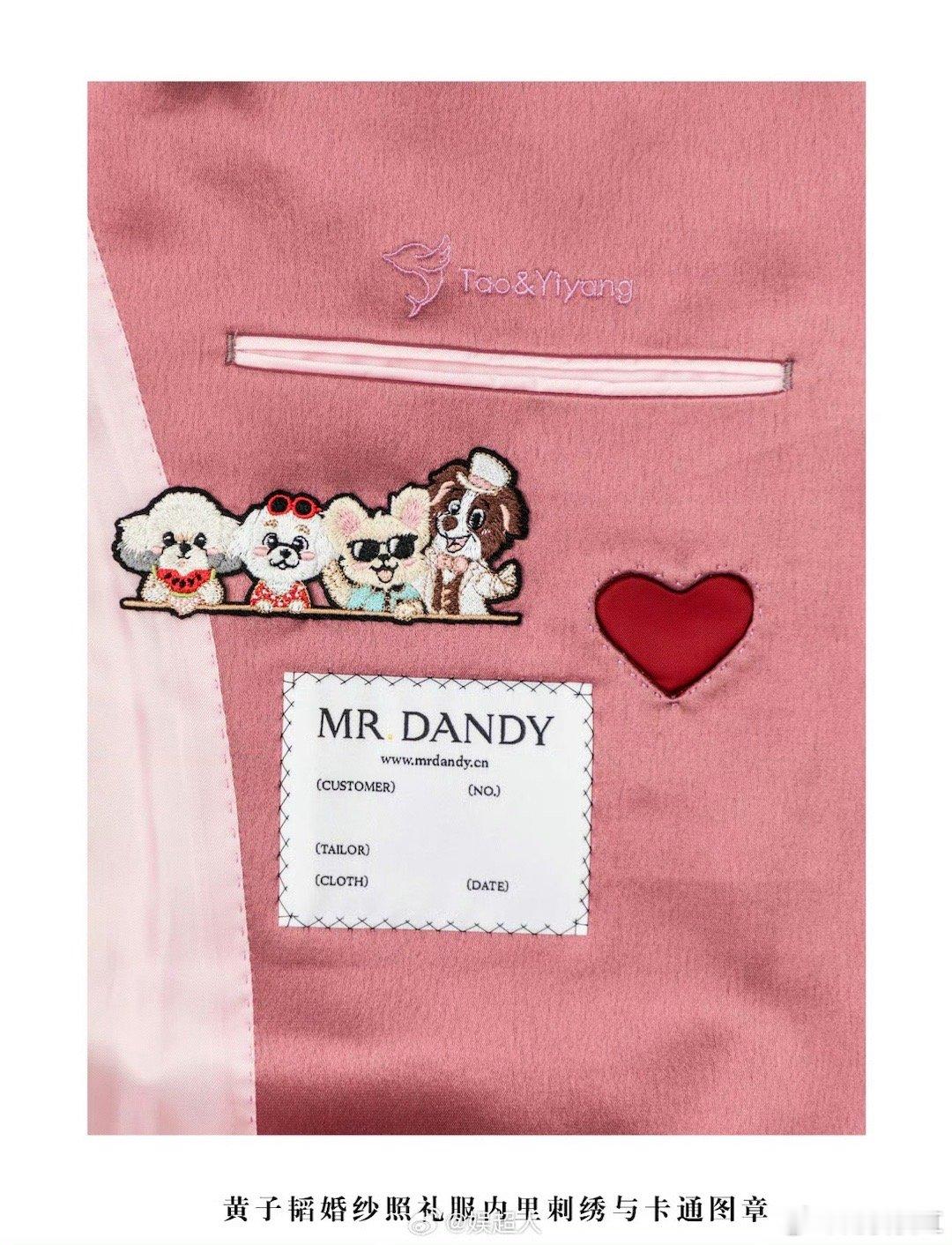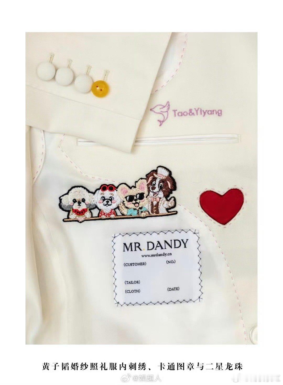 黄子韬礼服绣着徐艺洋和四只狗狗黄子韬礼服细节 婚服设计满是巧思!绣上徐艺洋、四只狗狗和爱心,把平凡日子的温暖融入婚礼,每个细节都在说“爱意藏不住”。