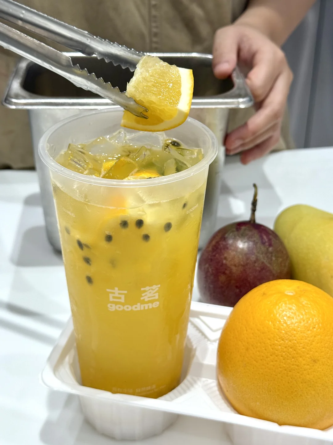 加了赣南鲜橙块+现切的香水柠檬和芒果丁+百香果浆