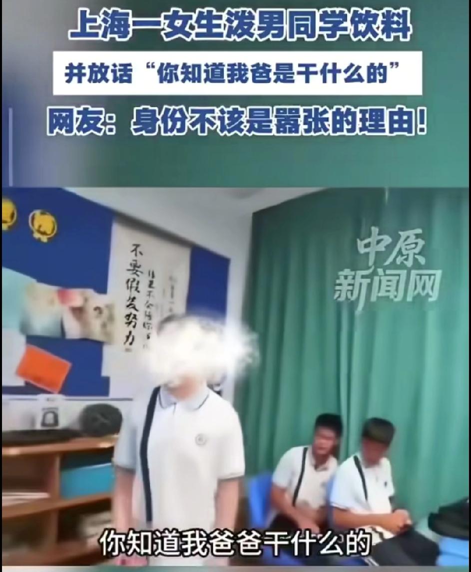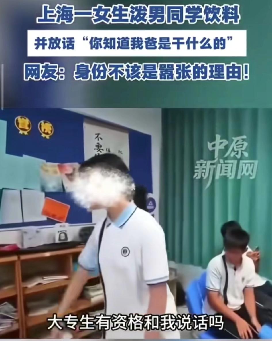 太嚣张了 一女生连续向一个男生 泼饮料水,嘴里还嚷嚷着“你知道我爸是干什么的吗,我一点也不好惹,像你这种上中专大专的人有资格和我说话吗” 言辞激烈,具有侮辱性,旁边的其他学生在一旁默不作声 该男生忍无可忍决定回击,被一旁的一个同学拉开了 学校的工作人员称,目前学校已经着手处理这件事,也会请示领导有结果了会第一时间给社会一个交代一个说法 不管你爸是干什么的,都不应该成为你嚣张跋扈肆意羞辱他人的理由!