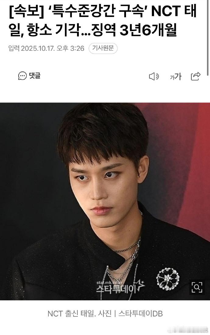 文泰一二审上诉被驳回文泰一二审维持原判 据韩媒17日报道,因“特殊准强奸罪”被拘捕的前NCT成员文泰一二审上诉被驳回,维持原判,被判处有期徒刑3年6个月。