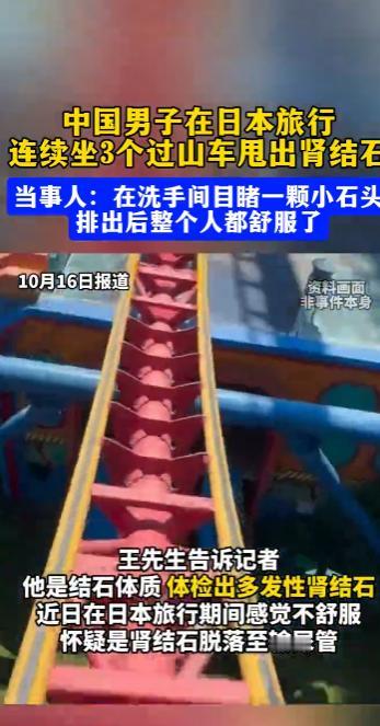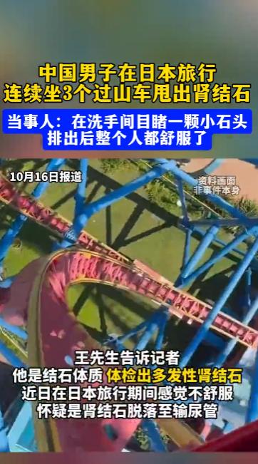 “离了个大谱!”10月15日,一男子在游乐园坐完3个过山车后上厕所,竟然发现困扰自己的肾结石被“甩”了出来,结石排出后他整个人一下子就舒服了,网友:坐个过山车看病钱都省了! 得了肾结石别提有多难受了,腰部疼痛无比,且排结石时最折磨人,结石小还好说,运动运动说不定能掉下来,大点就需要去医院碎石了。 一男子外出旅游时,突然出现了尿频尿急等不适症状,他怀疑是自己的结石掉下来了,准备到医院去检查看看,奈何第二天他跑了当地几家诊所都关着门,只好按照原定行程到游乐园游玩。 在玩了3个过山车项目后,男子突然感觉到一股强烈的尿意,于是着急忙慌跑去厕所,谁知,如厕万男子发现自己竟然排出了一个米粒大小的黑石粒,这可让他吃了一惊。 这个小黑石粒排出后,男子忽然感觉先前的不适一扫而空,整个人一下子就舒服了,他意识到这个小石粒很有可能就是自己的肾结石,应该是乘坐多次过山车硬生生“甩”了出来。 不少网友认为男子坐个过山车看病钱都省了,不得不说,男子确实很幸运,但是这种事情毕竟是小概率事件,高强度刺激排石很有可能会带来风险,出现这种情况最好还是先去医院检查一下,遵照医嘱治疗。 信息来源:《男子连续坐完3个过山车后竟甩出了肾结石:大小就像米饭里混的小石子,排出来后整个人一下子就舒服了》观威海