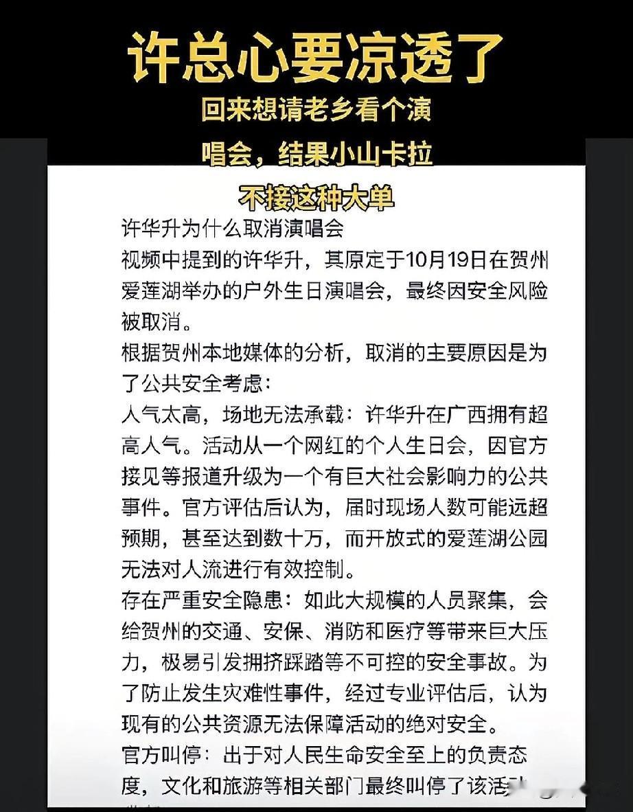 许华升为什么贺州演唱会被取消了?原因说得非常清楚,而不是网友们所传的那样得罪谁了