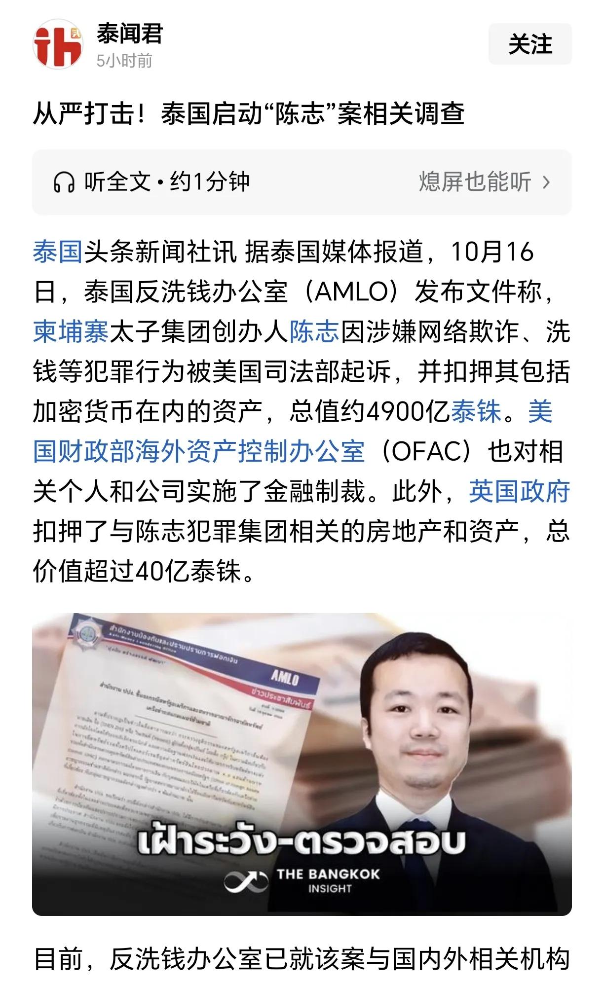 美国对太子集团陈志正式下手后,英国跟着冻结、查封陈志在英国的名下财产。 现在泰国也要跟上调查了,全球范围内估计不少国家也会跟进调查,查封冻结陈志在本国境内的财产,分上一杯羹。 陈志根据报道,说他有香港上市公司股份的,就不知道我们会不会跟着一起有所行动。