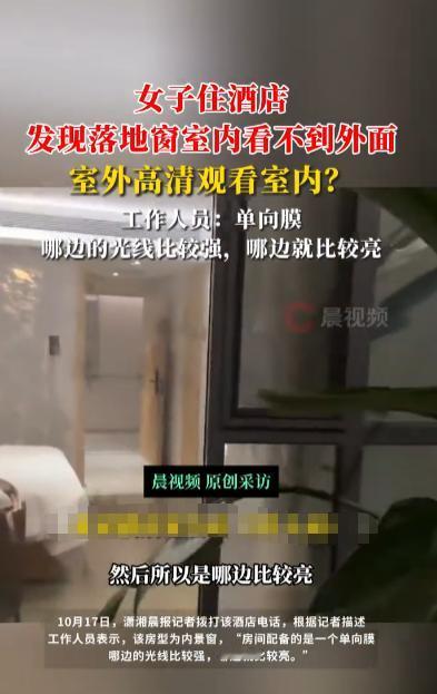 “离了个大谱!”2025年10月,吉林延吉,一女子住酒店时发现房间内的落地窗的玻璃像镜子一样,室内完全看不到外面,可外面却能将房间内看得一清二楚,网友:这是装反了吗? 出门住酒店大家都担心有摄像头,会泄露个人隐私,但是除了摄像头之外,酒店的窗户也得着重注意。 一女子出门旅游入住了当地一家酒店,她进到房间里后发现窗户有些不对劲,只见落地窗的玻璃就像一面镜子一样,清晰照出屋内的全貌,却完全看不到外面。 意识到不对的女子跑到了酒店外面查看,从外面透过玻璃能将屋内的一切看得一清二楚,甚至可以说是“高清”画面,就连屋内的电视播放内容都能看见,这可把女子吓了一跳。 酒店工作人员表示,这个房间是内景窗,窗户上是单向膜,哪边亮就能看到哪边,白天的时候室外比较亮,这时候从屋外就看不到屋内,因为女子入住时是晚上,房间内比较亮,才会出现从外面能看清里面的情况。 不少网友表示这样的设计有些过于荒谬了,如果不知道的人洗完澡出来没穿衣服,那也太尴尬了,不管怎么说,以后出门住酒店除了检查摄像头外还得加上一条了,那就是拉窗帘! 信息来源:《展开女子住酒店发现落地窗室内看不到外面,室外高清观看室内?工作人员:单向膜》潇湘晨报