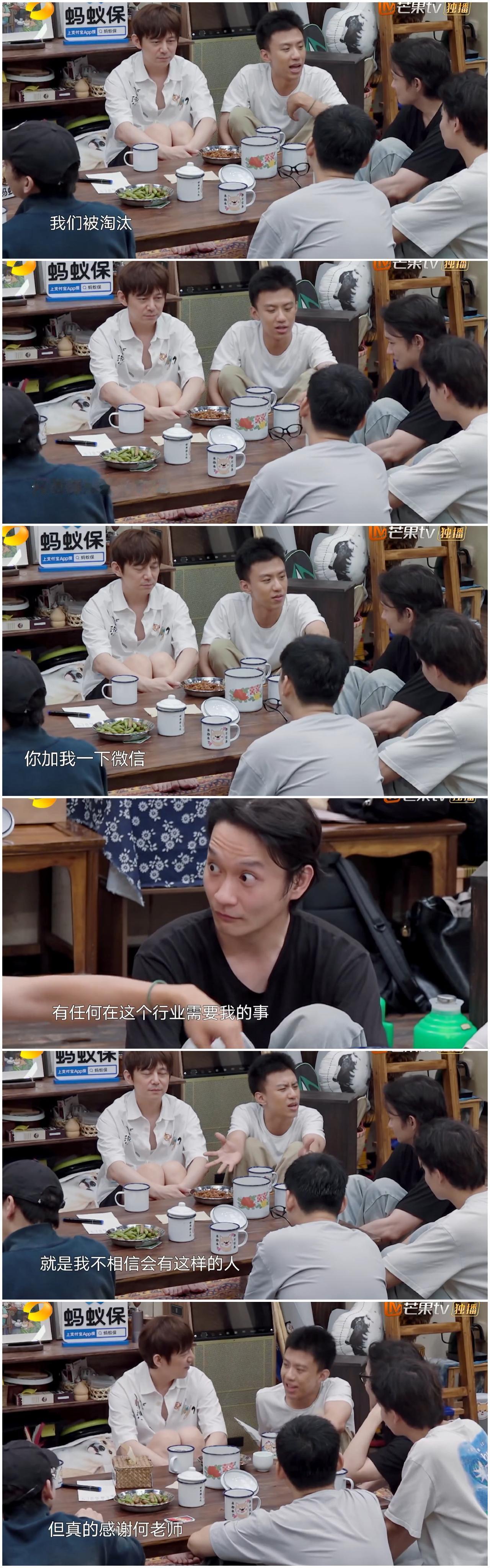 何炅主动要加被淘汰的付航的微信, 承诺付航需要时可以提供帮助, 但是李诞抱着何炅