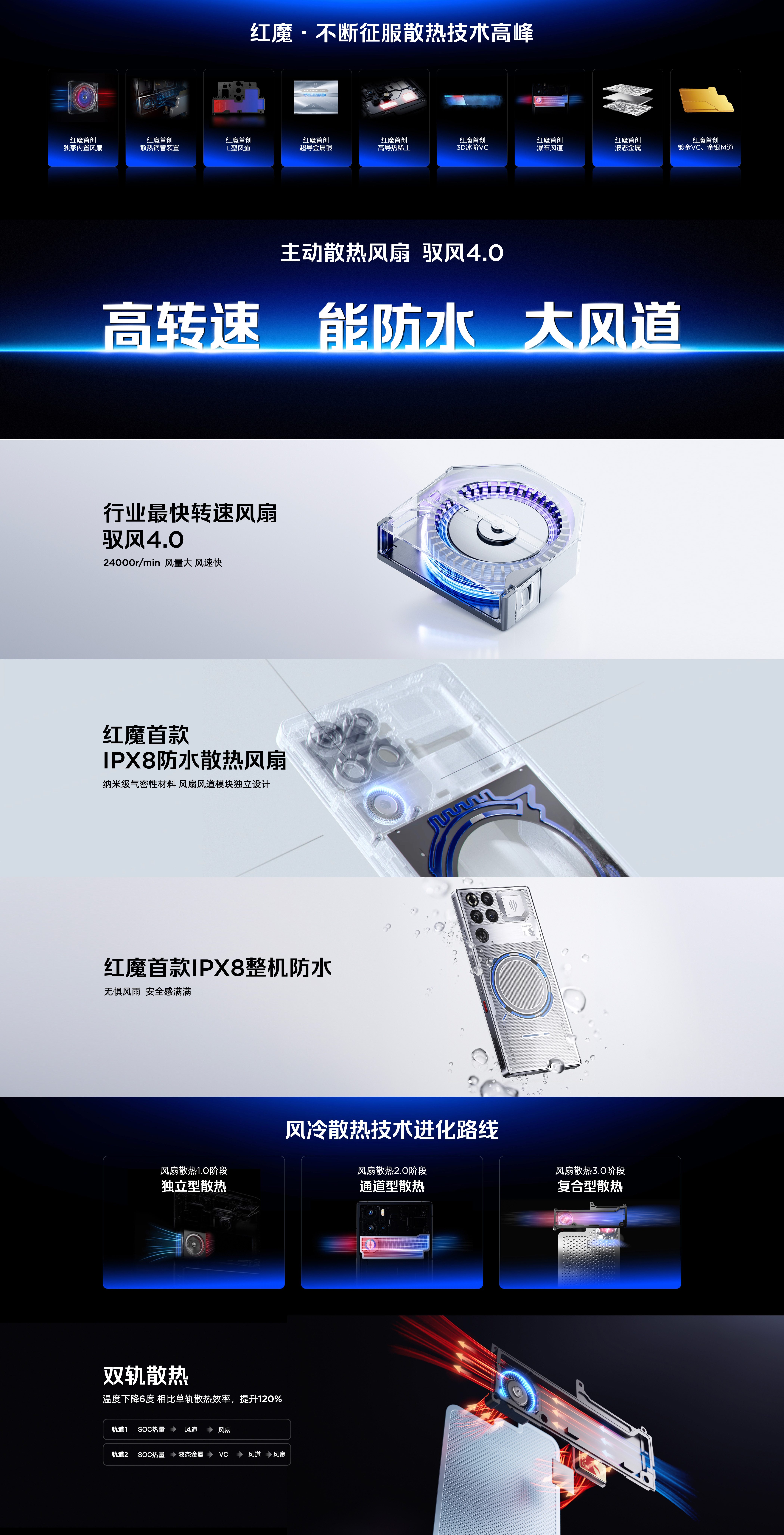 红魔11 Pro系列搭载「主动散热风扇 驭风4.0」,24000r/min 风量大,IPX8防水散热风扇,IPX8整机防水。