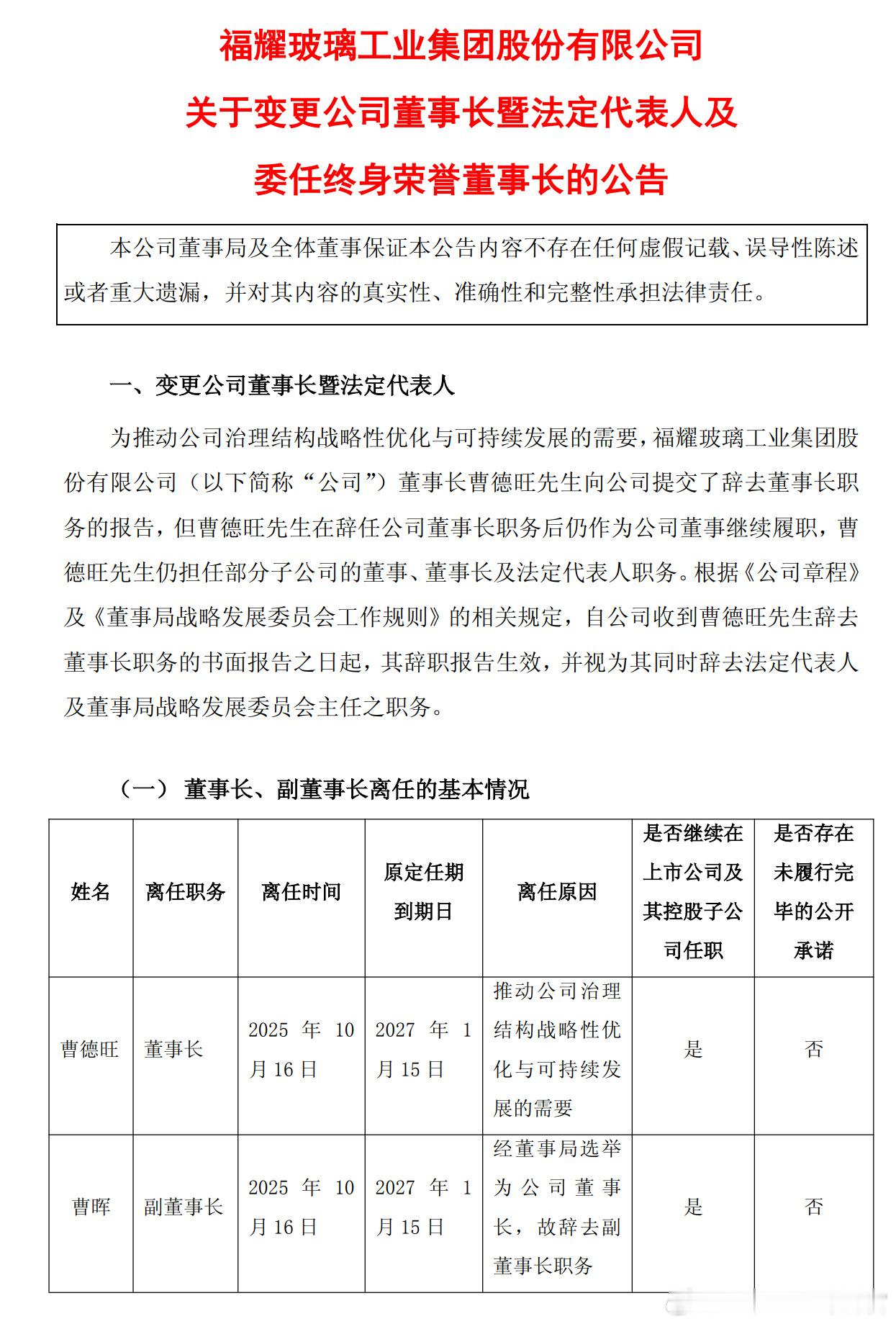 福耀玻璃董事长曹德旺正式卸任,由儿子曹晖接任。同时,曹德旺被委任为公司终身荣誉董事长。