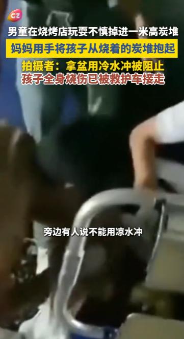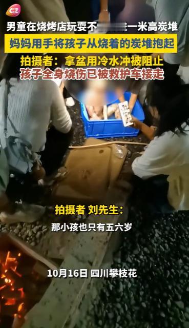 “悲剧还是发生了!”10月16日,四川攀枝花,一男童在烧烤店玩耍时,不慎被绊倒跌入了正在燃烧的1米高碳堆,孩子母亲用手将其从滚烫的碳堆中抱起,网友:让人看着揪心! 一些烧烤店为了让顾客能体验烧烤的乐趣,提供围炉烧烤的服务,也就是顾客围着碳堆自己动手烤,可这种方式存在着一些安全隐患。 一男童跟着家长到烧烤店吃饭,大人们边烤边聊天,男童觉得有些无聊就自己在旁边玩耍起来,谁知,他在玩耍过程中不小心被绊倒,由于碳堆周围的围栏不高,男童直接栽进了正在燃烧的碳堆里。 孩子妈妈看到后急坏了,出于母亲的本能,她来不及思考太多,直接用手将男童从滚烫的的碳堆里抱出,好像感觉不到疼痛一样。 虽然男童及时被抱出,但是碳堆的温度太高,他的全身都被烧伤,大人们将他放在了一个塑料盆里用冷水冲洗,但是被人阻止,称这样做可能会让伤口感染,随后男童就被救护车接走送医。 不少网友表示看着让人揪心,纷纷关心孩子的状况,大人如果要带孩子到类似的地方吃饭,一定要看管好孩子,一旦悲剧发生,后悔都来不及! 信息来源:《男童在烧烤店玩耍,不慎掉进一米高炭堆里,妈妈用手将孩子从烧着的炭堆抱起,拍摄者:孩子全身烧伤已被救护车接走》广州广播电视台