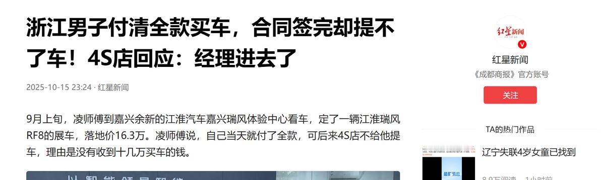 浙江嘉兴,一男子花16.3万,订了辆江淮瑞风RF8的展车,合同签完,男子支付了全款,男子想提车时,联系销售经理,谁知经理电话不接,消息不回,不见人了,男子找到4s店里,店里不给提车,说经理进去了,店里没收到钱,男子急了,拿出合同一看,合同只有经理签名,没有盖章,他付款的账户,是经理个人账户,4s店只收到定金10000元,男子崩溃:那我不能钱也没了,车也没拿到吧? 这事得从 9 月初说起,凌师傅琢磨着买辆家用车,转了嘉兴好几家 4S 店,最后看中了余新那家江淮汽车体验中心里的瑞风 RF8 展车。 车子就摆在展厅正中央,锃亮的车身看着特别踏实,接待他的是店里的仇经理,据说还是销售负责人,说话做事都透着一股靠谱劲儿,仇经理不仅把车的配置讲得明明白白,还额外承诺能给这辆展车升级航空座椅,说这样提车后直接就能用,省得再跑一趟改装店。 凌师傅被这周到的服务打动了,当场就拍板订车落地价 16.3 万,他没犹豫当天就准备付全款,签合同的时候,他注意到纸上只有仇经理的签名,没盖 4S 店的公章,刚想问两句,仇经理就笑着解释,自己是店里的负责人,签名比公章还管用,凌师傅想着人家是经理,又是在正规 4S 店里交易,总不能出问题,就没再多计较。 扫码付款时,他特意瞥了眼收款方,显示的是 “嘉兴江淮汽车”,完全没怀疑这竟是仇经理的私人账户,爽快地把钱转了过去,满心期待着国庆开新车带家人出去玩。 眼瞅着国庆假期快到了,凌师傅联系仇经理准备提车,对方却找了个理由,说厂家的航空座椅还没到,等配件齐了一起装好再提车上牌也方便。 凌师傅觉得这话在理,就答应再等等。可没几天,他发现不对劲了,仇经理的电话打不通,微信也没人回,就像凭空消失了一样,凌师傅心里发慌,四处打听才得知一个惊人的消息,仇经理被抓了。 他赶紧冲到 4S 店要说法,可店里的答复让他如遭雷击,车不能提因为公司根本没收到他的购车款,凌师傅当场掏出手机翻出支付记录,销售员一看就皱了眉,说这钱进的是仇经理的个人账户,财务那边只收到过 1 万元定金。 直到这时凌师傅才恍然大悟,原来自己被那个看似靠谱的经理摆了一道,当时那串 “嘉兴江淮汽车” 的收款名,竟是对方精心设下的圈套。 看着合同上孤零零的签名,想起自己付出去的 16.3 万,凌师傅急得直跺脚,心里只剩一个念头,总不能钱也没了车也没拿到吧?他和 4S 店理论,说交易是在店里发生的,对接的是店里的经理,责任不该由消费者承担。 可店里的人解释,仇经理其实是承包了卖车业务的承包商,相当于 “店中店” 模式,公司只负责提供车辆,收款的事管不着,现在钱没进公账,没法出具合格证自然提不了车。 后来凌师傅找记者咨询了律师,才知道自己不是没处说理,律师说仇经理在 4S 店的经营场所里以负责人身份签合同、收钱,消费者有理由相信他的行为代表店里,就算合同没盖章,买卖合同关系也算成立,4S 店理应交车,之后再去找仇经理追讨款项。 凌师傅这才稍稍安心,可更让他无奈的是,后来他见到了被放出来的仇经理,对方却说钱已经花光了根本拿不回来。 现在那辆瑞风 RF8 还被扣在 4S 店里,凌师傅还在和店家僵持交涉,他的遭遇其实不是个例,不少小车商为了省成本搞这种承包销售,把风险都转嫁给了消费者。 买大件东西千万不能马虎,签合同必须要盖公司公章,付款前一定要确认是对公账户,哪怕对方是 “经理”,哪怕收款名看着再正规,也得多留个心眼,毕竟钱一旦付错了地方,想要追回来可不是件容易事,谁也不想经历这种钱车两空的糟心事。 (信息来源:红星新闻——浙江男子付清全款买车,合同签完却提不了车!4S店回应:经理进去了)