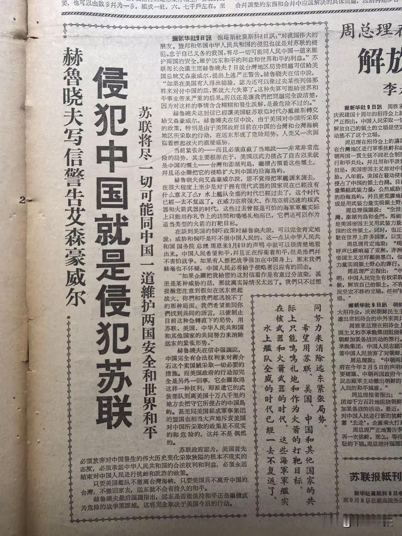“侵犯中国就是侵犯苏联。”——1958年《人民日报》。彼时,中苏处于重要的友好同盟阶段。这句话如重磅信号弹,彰显出中苏紧密的战略协作关系。 在动荡国际局势下,这是坚定的立场宣示,震慑着妄图侵犯中国的势力。中苏相互支持、携手共进,在政治、经济、军事等多领域合作,共同应对外部挑战,为地区和平稳定注入强大力量,也在中国外交史上留下浓墨重彩的一笔。