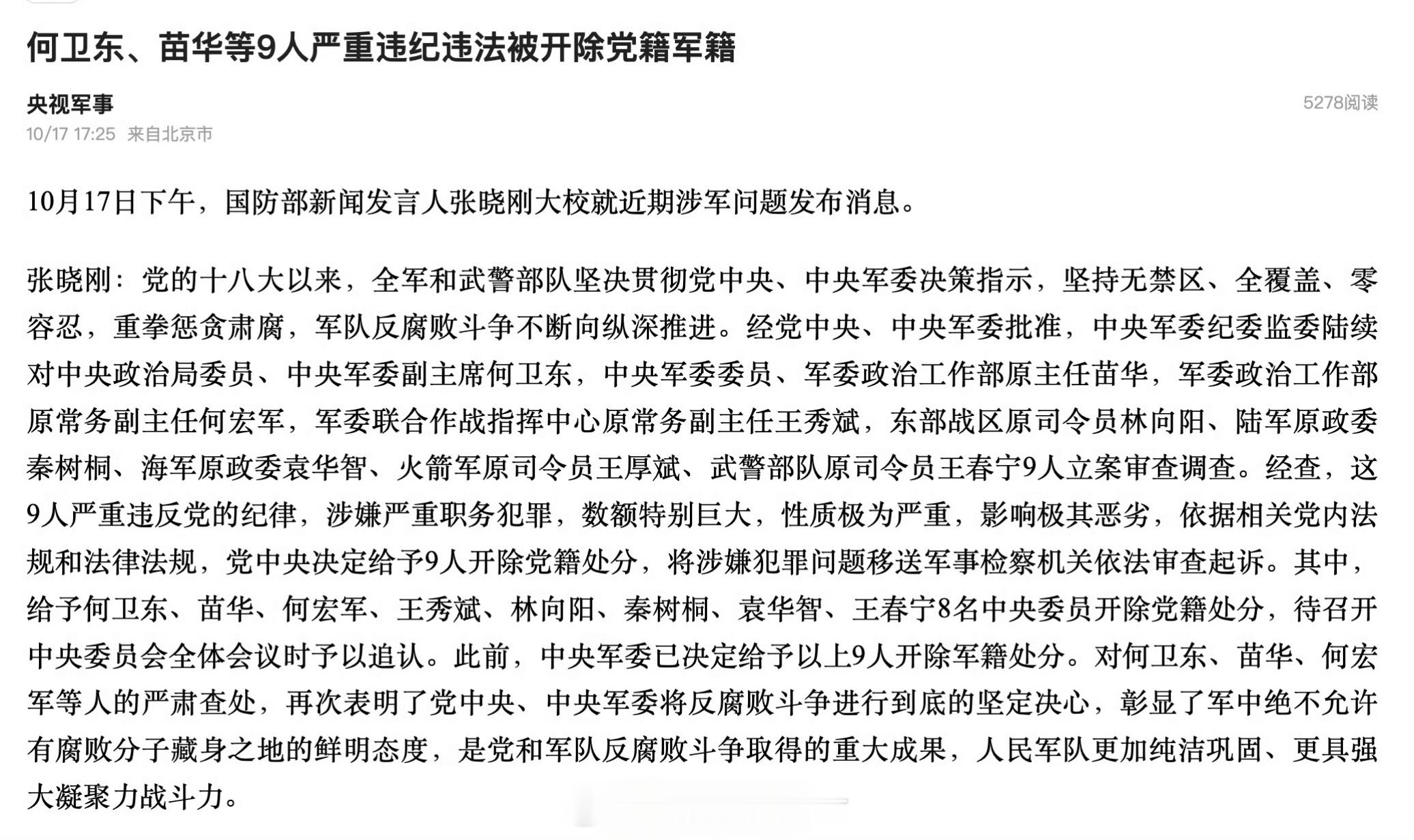 何卫东等9人被开除党籍军籍严查贪污腐败,绝不姑息!