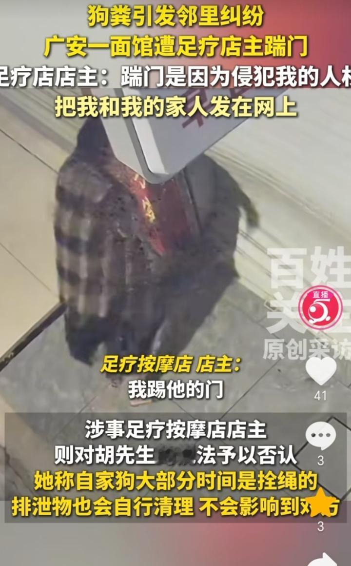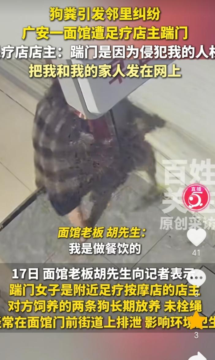 双方各执一词!四川广安,视频中一女子连续猛踹一面馆的卷帘门,导致卷帘门损坏,原因双方各执一词。 据百姓关注报道,10月16日四川广安,一面馆遭到足疗店女店主连续踹门,导致卷帘门被损坏,面馆老板称,女子是附近足疗店店主,对方养了两条狗长期放养不栓绳,经常在面馆门前街道上排泄招来苍蝇蚊子往店里飞,遭到我投诉了几次,因此加大了矛盾。 足疗店女店主称,踹门和狗没有关系,是因为他侵犯了我的人权,他把我女儿还有儿子以及我发到视频上,我的狗大部分时间都在拴着,那个狗排泄物也会自行清理,自家狗还曾被面馆老板用摩托车撞伤导致后腿截肢。 双方各执一词都觉得自己有理,对错这个我们暂时无从知晓,但是足疗店女店主踹面馆老板卷帘门导致损坏,这点有监控作证,足疗店女店主也是抵赖不了的,这就存在故意损坏,是需要给赔偿修理的。 有矛盾就应该解决矛盾,双方的法律意识都太过浅薄,解决问题的方式方法存在不当,摩托车撞狗,拍别人家人发视频,以及用脚踹门,这些都有踩踏法律红线的嫌疑。 不过话说回来,很有可能确实是狗随地排泄,影响了面馆,面馆老板投诉无果,所以才选择拍视频发网上。对此,大家觉得呢?