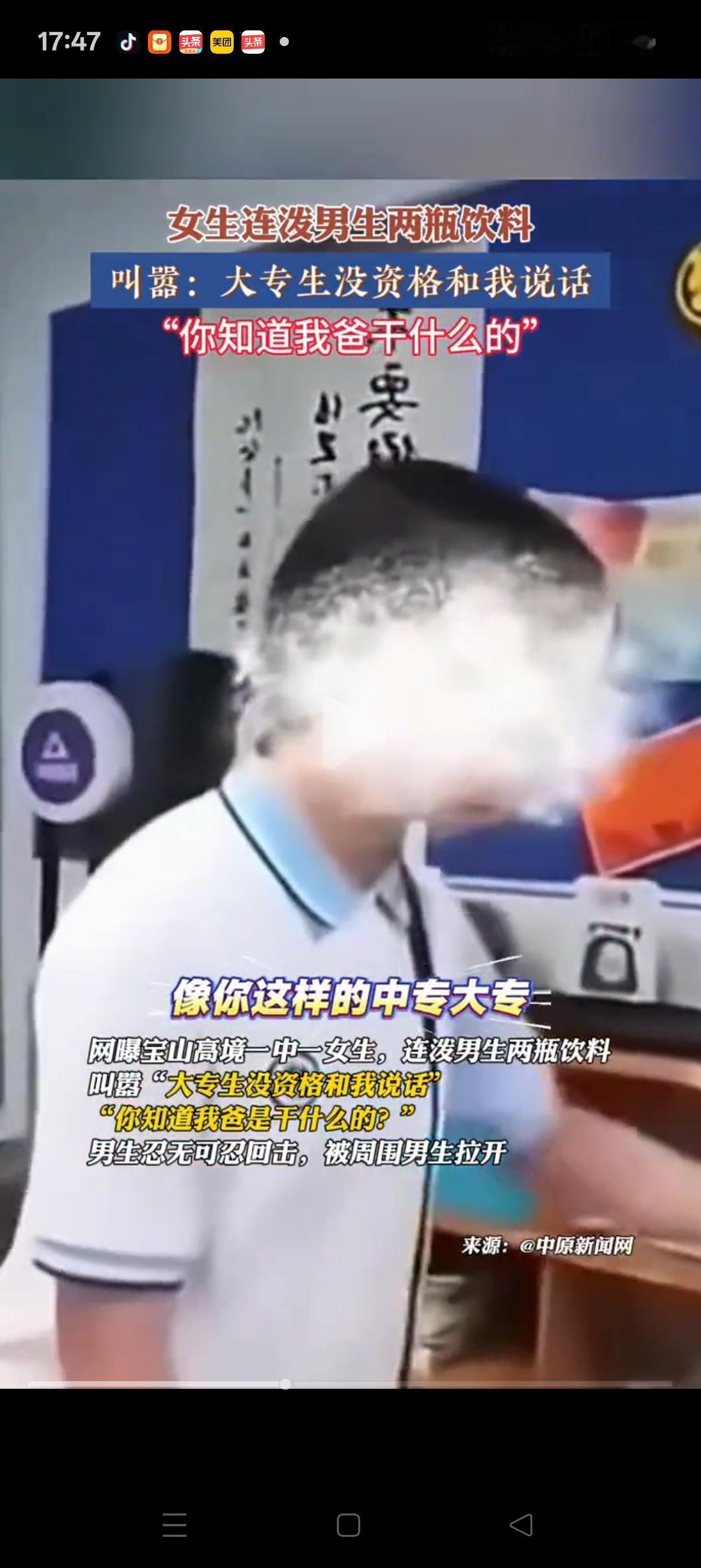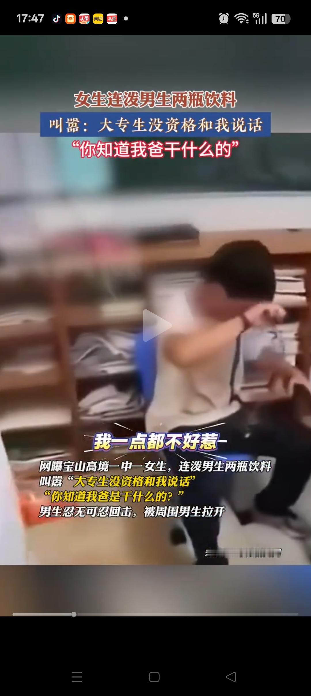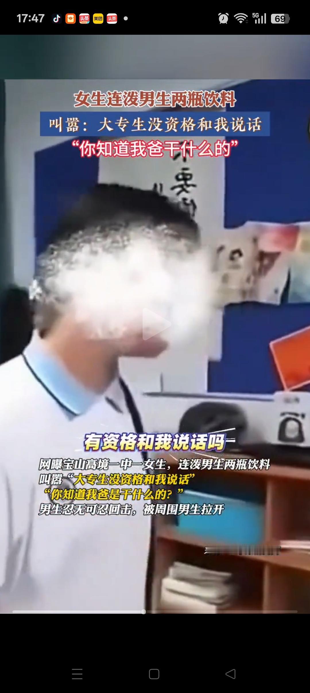 “你知道我爸是干什么的吗”,上海,一女生连泼二瓶饮料到男生脸上,并叫嚣“你知道我爸是干什么的吗”,“像你这样的大专生不配和我说话,”。男生忍无可忍,抱住了她的脖子,最后被同学们拉开。 其实当时教室里有不少同学,如果在女生泼一杯饮料的时候,就及时阻止,也不会有这种事。 也有可能是事出突然,大家当时没反应过来吧! 所幸在男生抱住女生脖子的时候,大家反应还挺快,立刻把他们拉开了。 现在最慌的是她爸,这个闺女真是让人不省心啊[捂脸][捂脸]