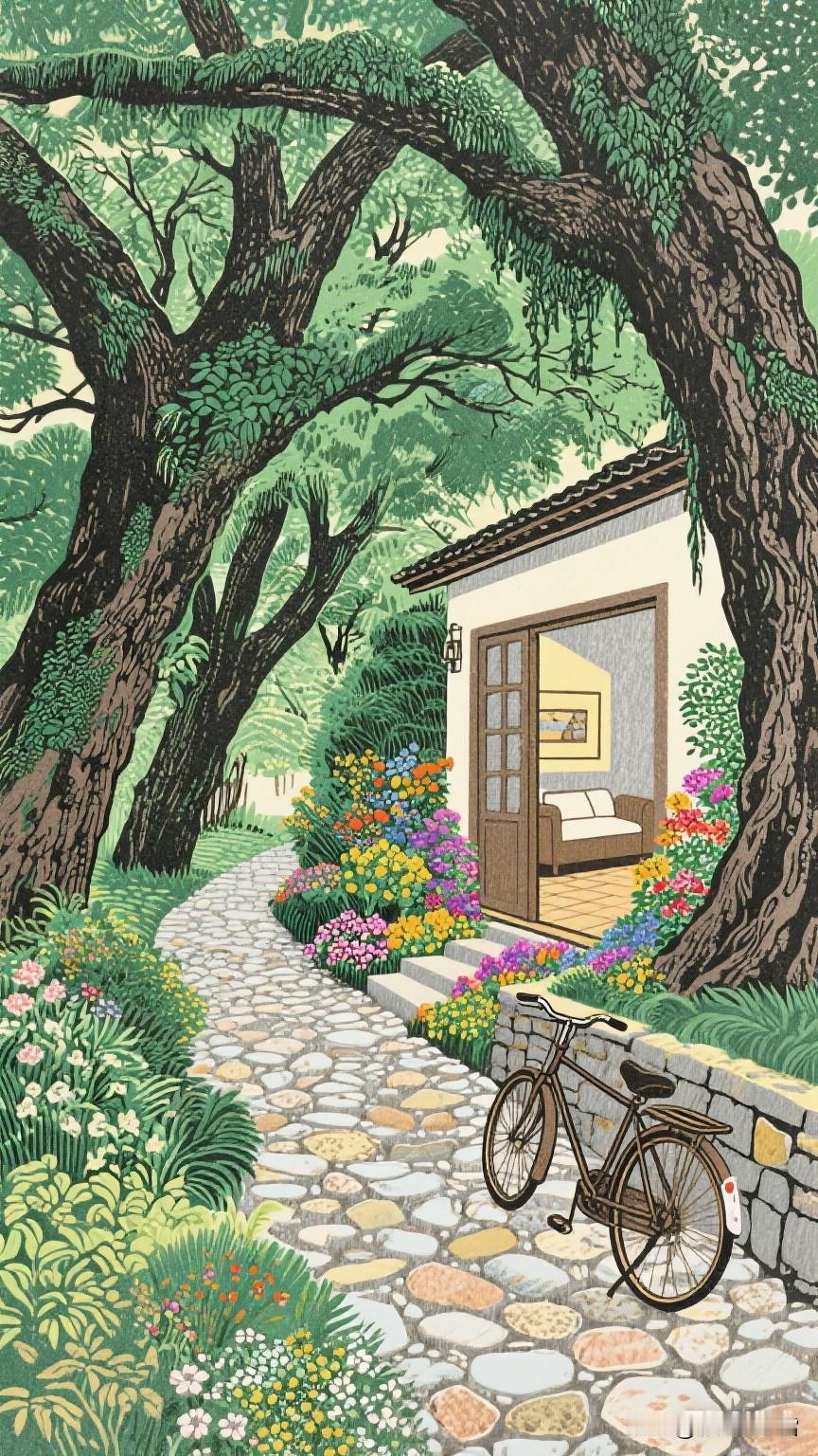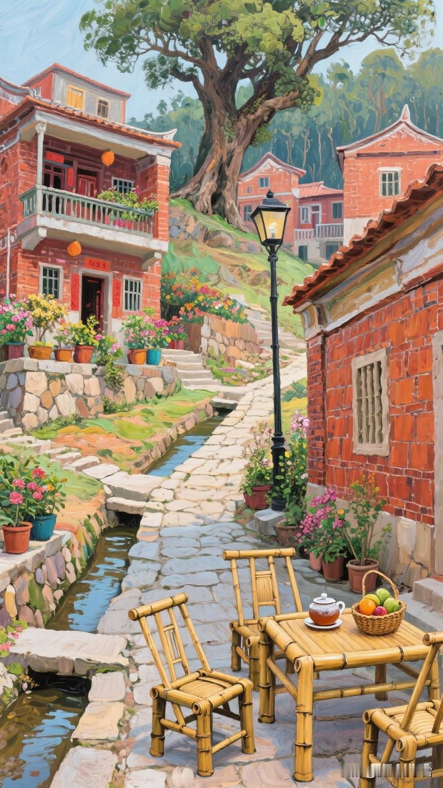 或是在花团锦簇的屋前,看日出浸染山林,让晚风裹挟着花香,把日子过成诗; 或是在古树掩映的小径,听鸟鸣与叶响和鸣,任时光在石路上缓缓流淌,偷得浮生半日闲; 或是在红砖古巷的茶桌旁,伴溪水潺潺,品一盏清茶,看繁花满院,把烟火气过成向往的模样。 每一处角落,都是心灵的归处,藏着对生活最温柔的期许。