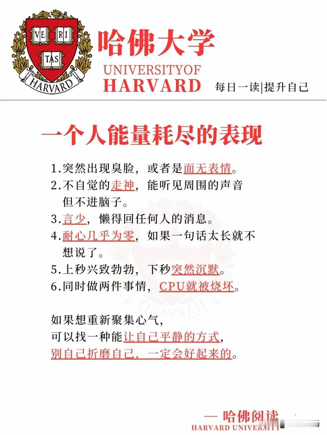 一个人能量耗尽的表现 1、突然出现臭脸,或者是面无表情。 2、不自觉的走神,能听见周围的声音但不进脑子。 3、言少,懒得回任何人的消息。 4、耐心几乎为零,如果一句话太长就不想说了。 5、上秒兴致勃勃,下秒突然沉默。 6、同时做两件事情,CPU就被烧坏。 如果想重新聚集心气,可以找一种能让自己平静的方式,别自己折磨自己,一定会好起来的。 (图片来源于网络) 分享每日感悟 领悟的人生哲理 能量对人的影响 无力的负面情绪 能量耗尽的表现 恢复能量秘诀