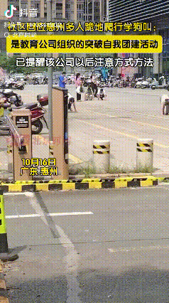 “已经突破物种了”!广东惠州,街上有多人跪地爬行并且学狗叫,社区对此做出回应。 据北京时间报道,10月16日广东惠州,街上出现多人跪地爬行并且学狗叫,社区回应称,据初步了解这是一个教育公司搞得一个突破自我的团建活动,已经提醒过公司,要注意方式方法。 作为教育公司,搞的突破自我的团建活动竟然是这么幼稚还带侮辱性的跪地爬行学狗叫,网友调侃,“这已经超出了突破自我的范畴,已经是突破物种了”。 这让我想到了一句话,那就是人可以穷,但是不能没有了尊严,原本突破自我团建主题应该是一种积极向上的活动,结果让人大跌眼镜。 希望事件的爆料,能让这个公司有所反省,现在是以人为本的社会,每个人都有自己的人格和尊严,这样带侮辱性的活动负面影响太大,理应禁止这样的活动。