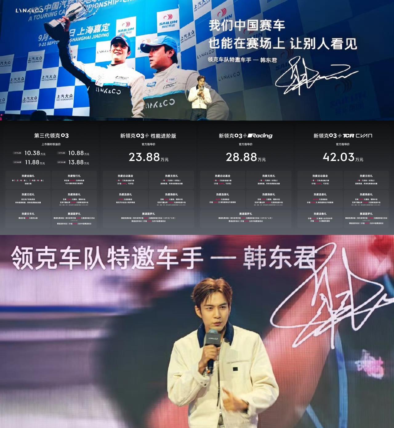 第三代领克03上市,新增极光银外部车漆,结合猎风前脸,视觉效果更低趴。 全新的领克03分为标准版、进阶版、03+Racing、03+TCR CYAN四大系列。售价10.38~42.03万元。 这次领克03在性能、智能、设计、体验四大维度进行了全面进阶。Drive-E 2.0TD T5 Evo发动机,匹配8AT变速箱,最大功率272马力,最大扭矩400N·m,百公里加速6.5秒; LYNK Flyme Auto智能车机系统与千里浩瀚辅助驾驶H3方案联合,实现39项安全驾驶辅助功能的丝滑交互。NOA高速领航驾驶辅助功能,有效识别并应对复杂路况;APA泊车辅助功能,自动识别车位、智能接管转向油门刹车,泊入泊出更安全便捷;RPA遥控泊车辅助功能,手机遥控泊车,狭窄车位也能自如出入,停车不烦恼。 不仅如此,韩东君作为首位驾驶新03+TCR Cyan版的车手,也来到了发布会现场。最大功率350马力,4.89秒的零百加速,凭借对赛车的坚定执念,外加03+TCR Cyan的战友身份,征战赛场这事儿指日可待。【来自懂车帝车友圈】