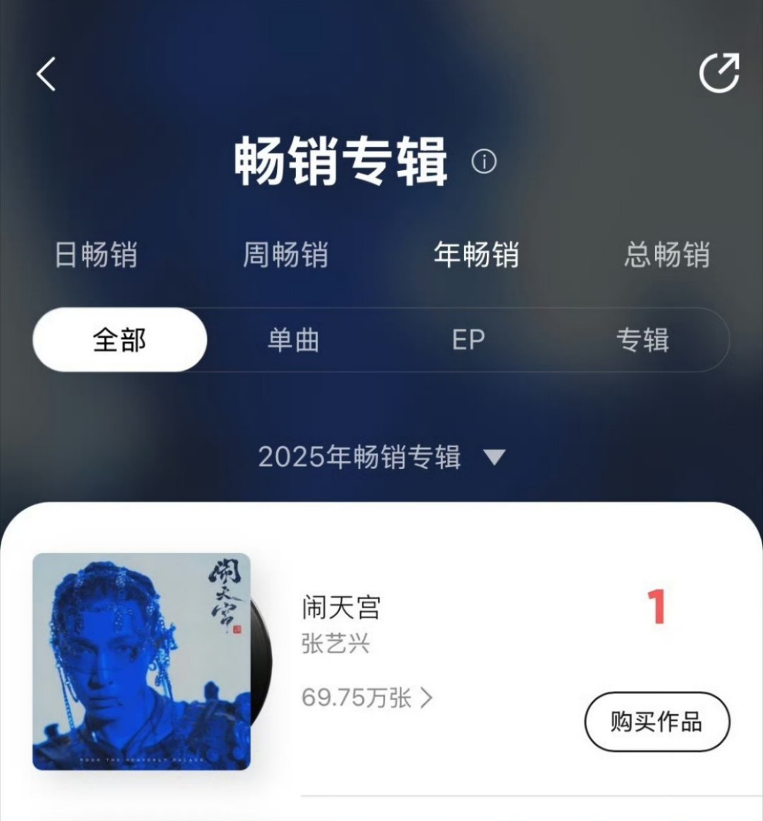 张艺兴新专《闹天宫》登Q音年榜第一了,仅用时40天,数字专辑总xl榜也是内娱top1[赞]