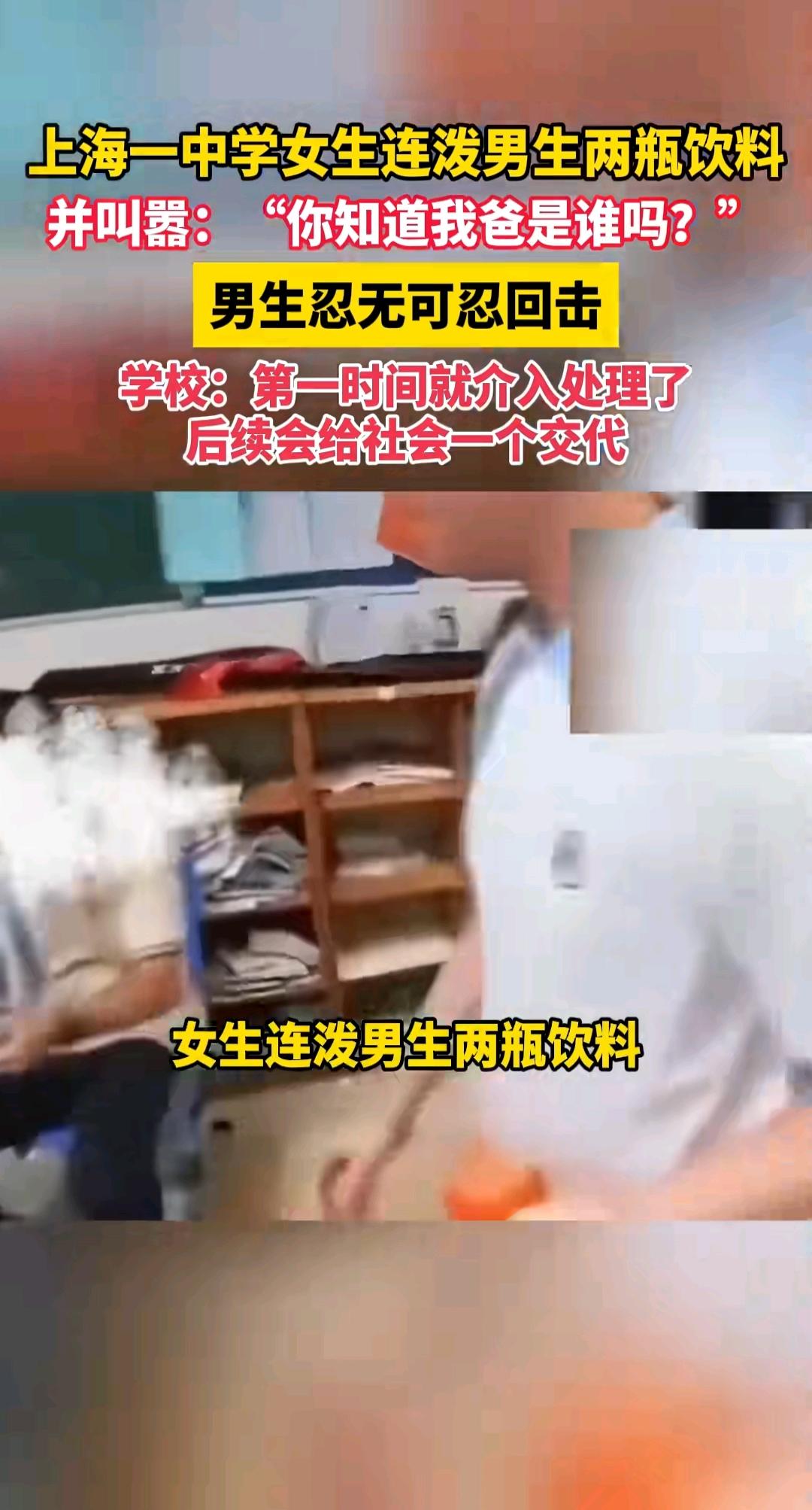 中学女生当众把两瓶饮料 泼到男生身上还喊你知道我爸是谁 在学校里 大家都是平