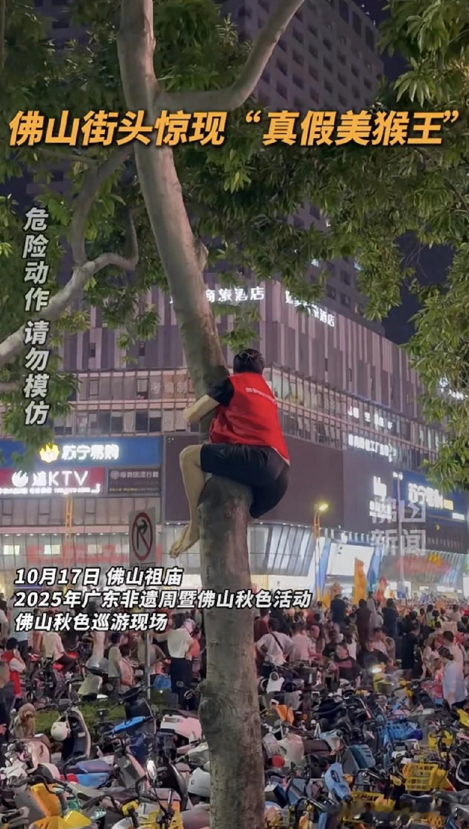 佛山秋色惊现爬树美猴王!为看非遗巡游! 佛山秋色彻底把人逼成“猴”!为了看非遗巡游,大哥直接爬上大树当“美猴王”,还有全家扛着梯子登高,现场人挤人堪比春运。非遗表演再精彩,也架不住这“野路子”观演姿势太吸睛!有人狂赞“这才是民间狂欢的灵魂”,也有人吐槽“太危险,纯属瞎折腾”。当传统文化撞上“硬核观演”,是民俗魅力的极致体现,还是一场用力过猛的闹剧?你会为了看表演这么拼吗?
