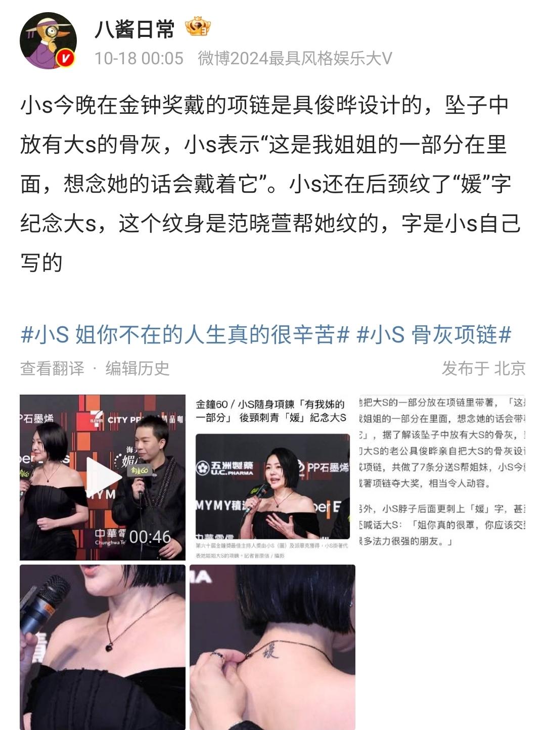 小S复出之后,拿下金钟奖综艺主持人奖,舞台上,小S直接痛哭,一个劲儿的提到自己已经去世的姐姐。 小 s 说,姐姐去世后,妈妈心里就一直有个洞,希望自己得的这个奖能帮妈妈把洞填满一些 何止妈妈心里有洞啊,小S心里估计也有一个大洞,无论是背后纹的姐姐名字,还是脖子上戴的姐姐骨灰做的项链,都是证明小S始终没有走过那个坎 不知道这次得奖能将小S洞填满多少