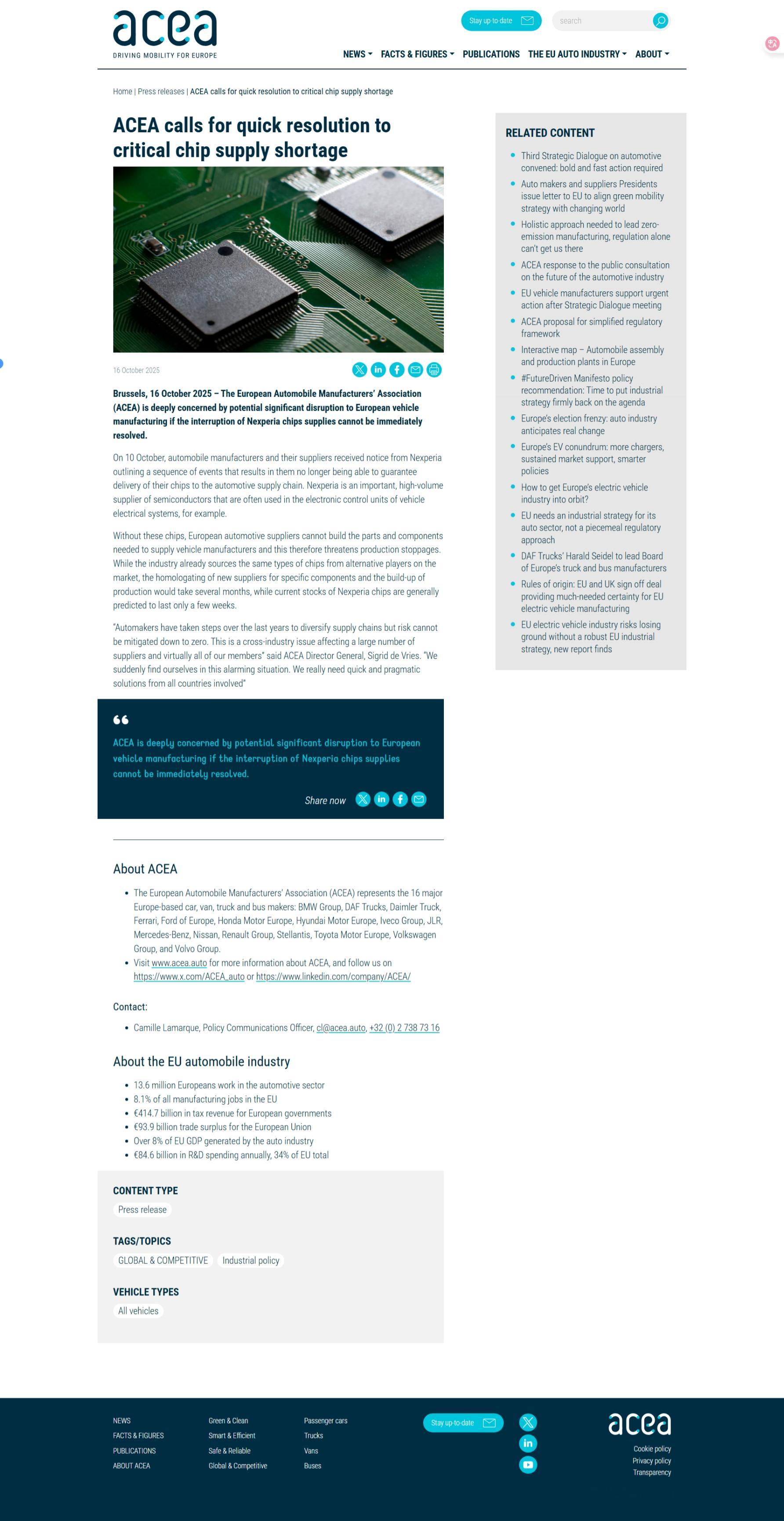 🔻欧洲汽车制造商协会(ACEA)当地时间10月16日发文表达深切担忧,称若安世半导体的芯片供应中断问题无法立即得到解决,欧洲汽车制造业可能会受到严重影响,“我们迫切需要所有相关国家迅速提出务实的解决方案”。