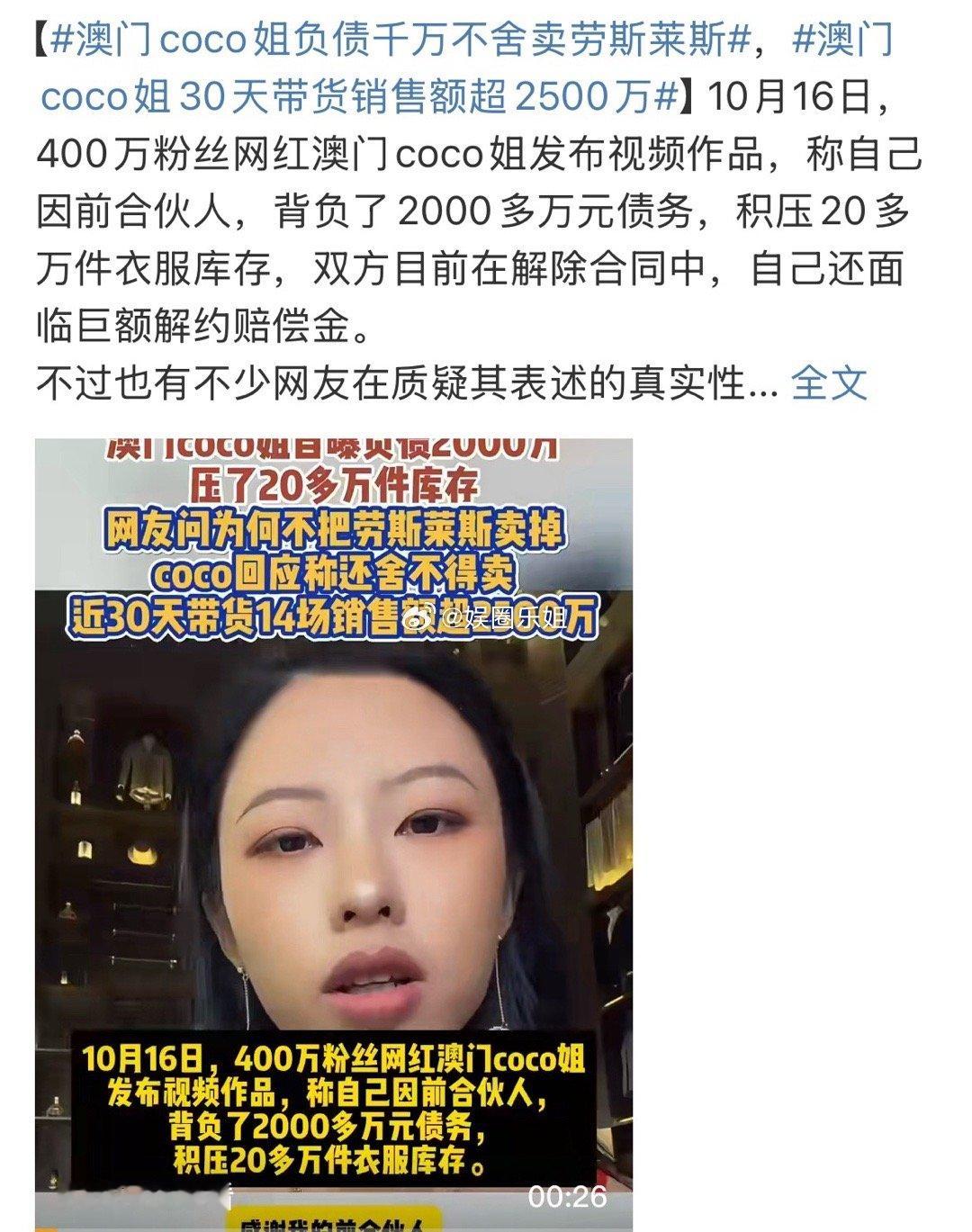 多次登顶男装类目直播榜首的澳门coco,说到底也是网红,对于网红来说她在网络上的所有行为都可以理解为是她的本职工作,无论她表达什么,都是她的工作,为了流量为了热度,这样理解更合理。