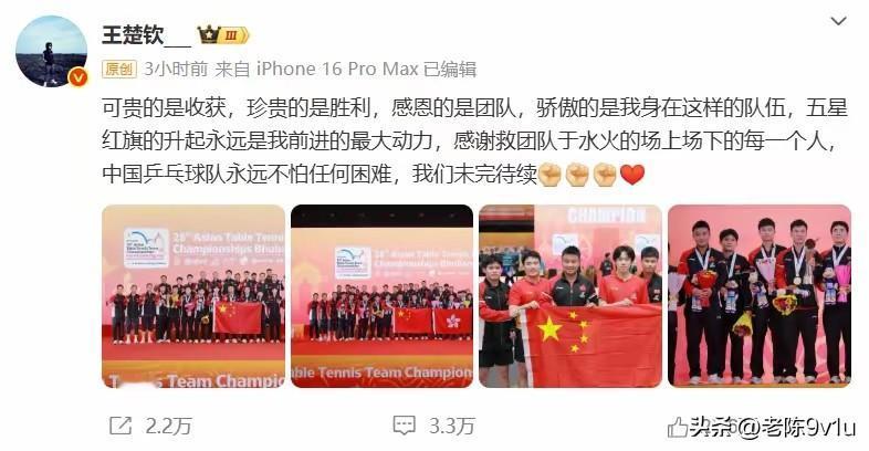 王楚钦疲惫仍战亚锦赛:源于对团队荣誉的看重和国家使命的担当 在2025年印度亚锦赛上,中国乒乓球队包揽男女团体冠军。王楚钦虽极度疲惫仍坚持参赛,源于对团队荣誉的看重和国家使命的担当。女团由孙颖莎、王曼昱、陈幸同、蒯曼和王艺迪领衔,决赛激战捍卫国乒荣誉。蒯曼参与此次重要赛事,展现团队协作力量。 李钦 3小时前 来自 iPhone 16 Pro Max 已编辑 的是收获,珍贵的是胜利,感恩的是团队,骄做的是的升起永远是我前进的最大动力,感谢救团队于水火目职球人永远不怕任何困难,