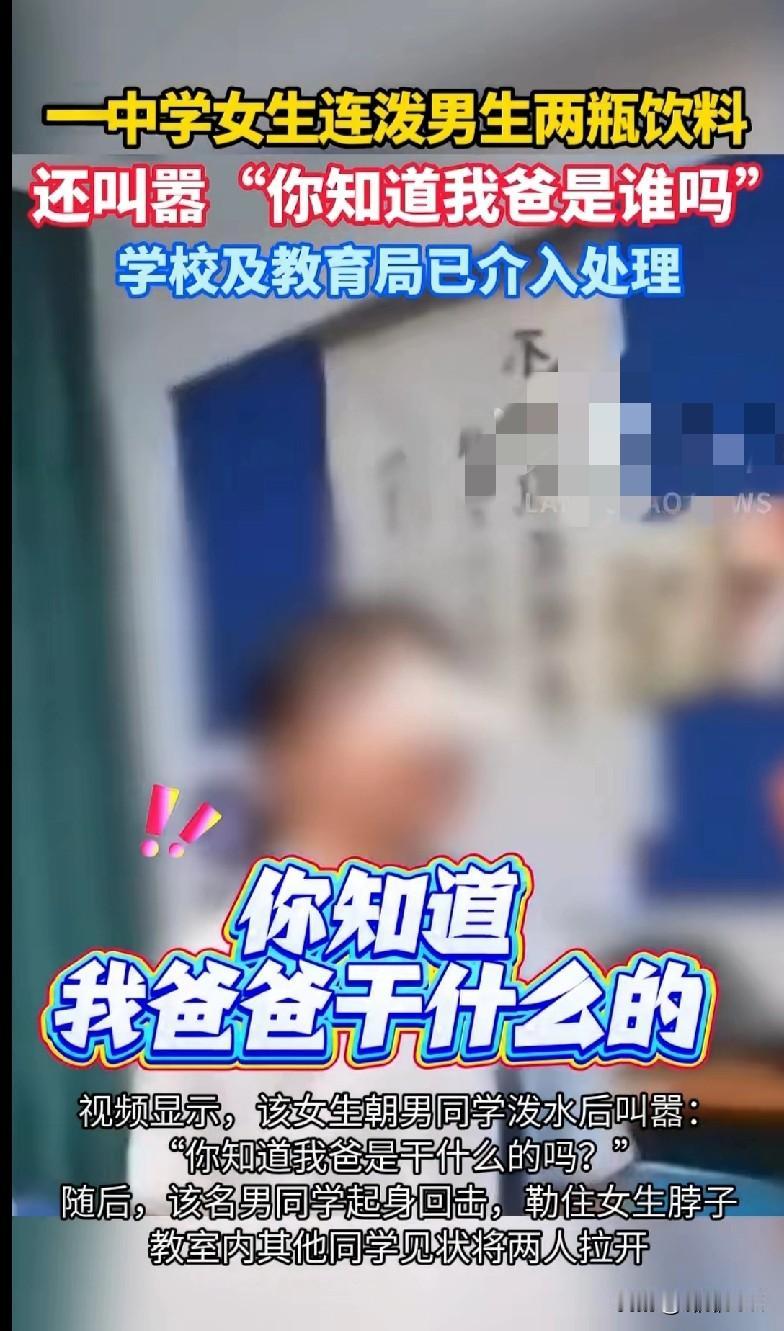 “家人们快看这操作!一中学女生连泼男生两瓶饮料,还狂叫嚣‘你知道我爸是干什么的吗?’ 男生气不过起身勒住她脖子,同学赶紧拉开…… 就这‘我爸’句式,梦回那些嚣张霸总文现场?不管你爸是干啥的,也不能仗着这就欺负同学吧!现在学校和教育局都介入处理了。 话说回来,这家庭教育和校园风气也太让人操心了。咱就想知道,最后能给个啥说法?你们觉得这事儿该怎么管?快到评论区唠唠!”