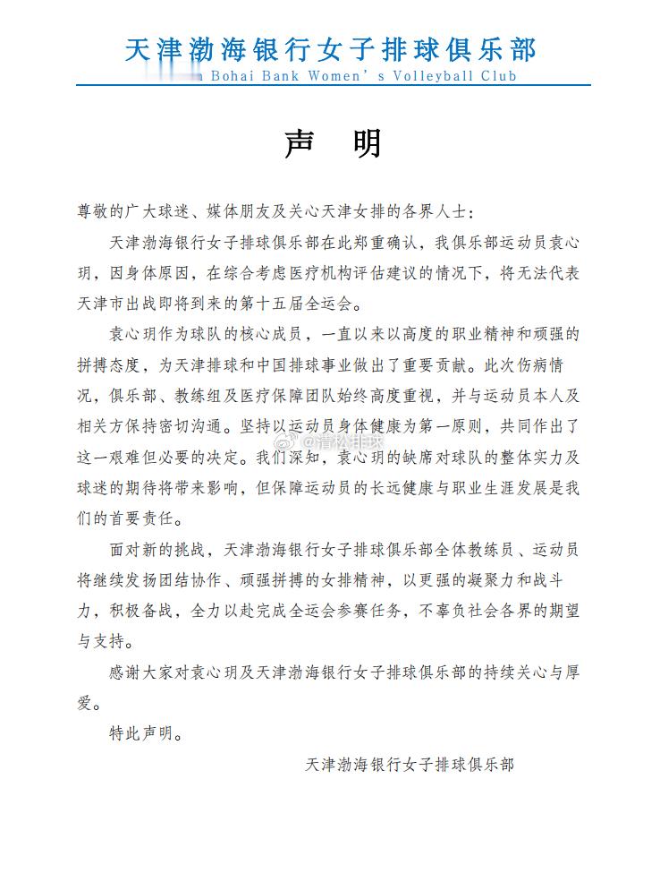 天津渤海银行女子排球俱乐部在此郑重确认,我俱乐部运动员袁心玥,因身体原因,在综合考虑医疗机构评估建议的情况下,将无法代表天津市出战即将到来的第十五届全运会。