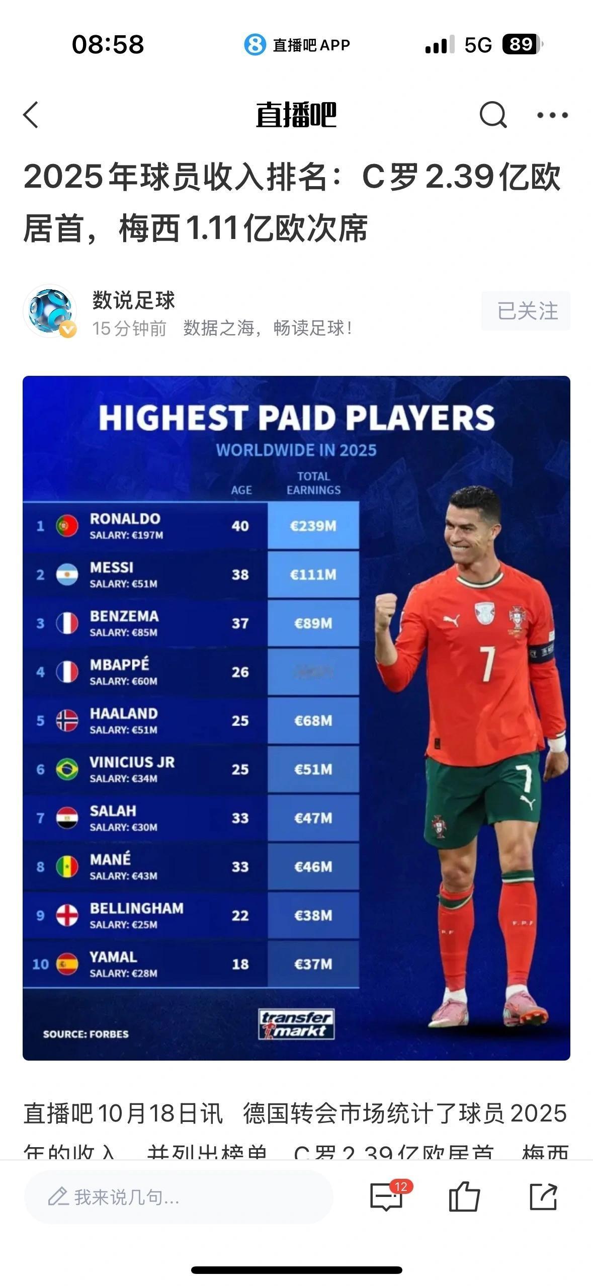 C罗还是足坛最赚钱的运动员呀! 2025年已经赚了2.39亿欧元,离开欧洲照样商业价值拉满。 梅西1.11亿欧元排第二,其他球员低于1亿。 姆巴佩,哈兰德都想学习罗球王吧,那就好好踢球,未来去沙特发大财![憨笑]