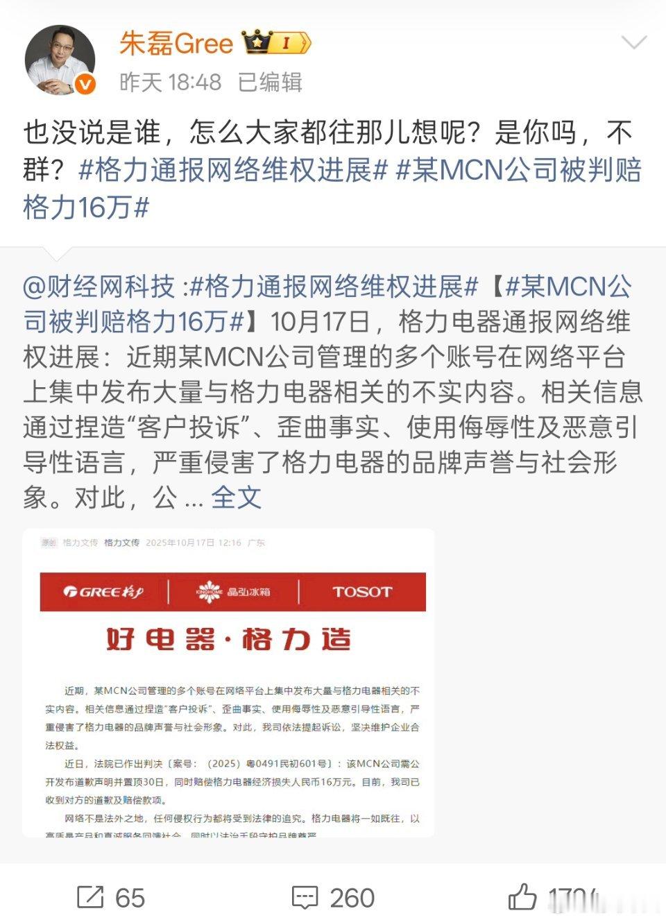 某MCN公司因抹黑格力,被判赔偿格力16万,格力高管朱磊的言辞很激烈啊。