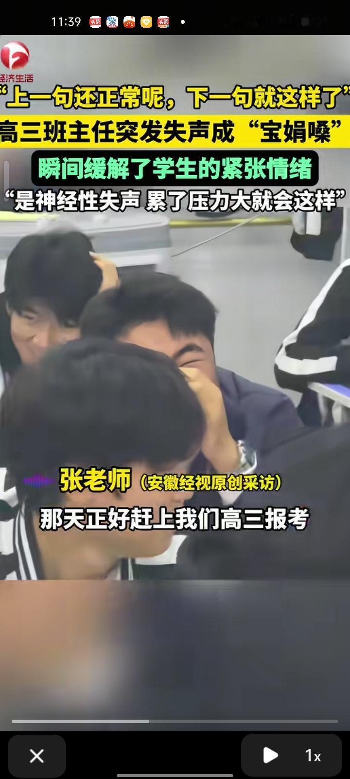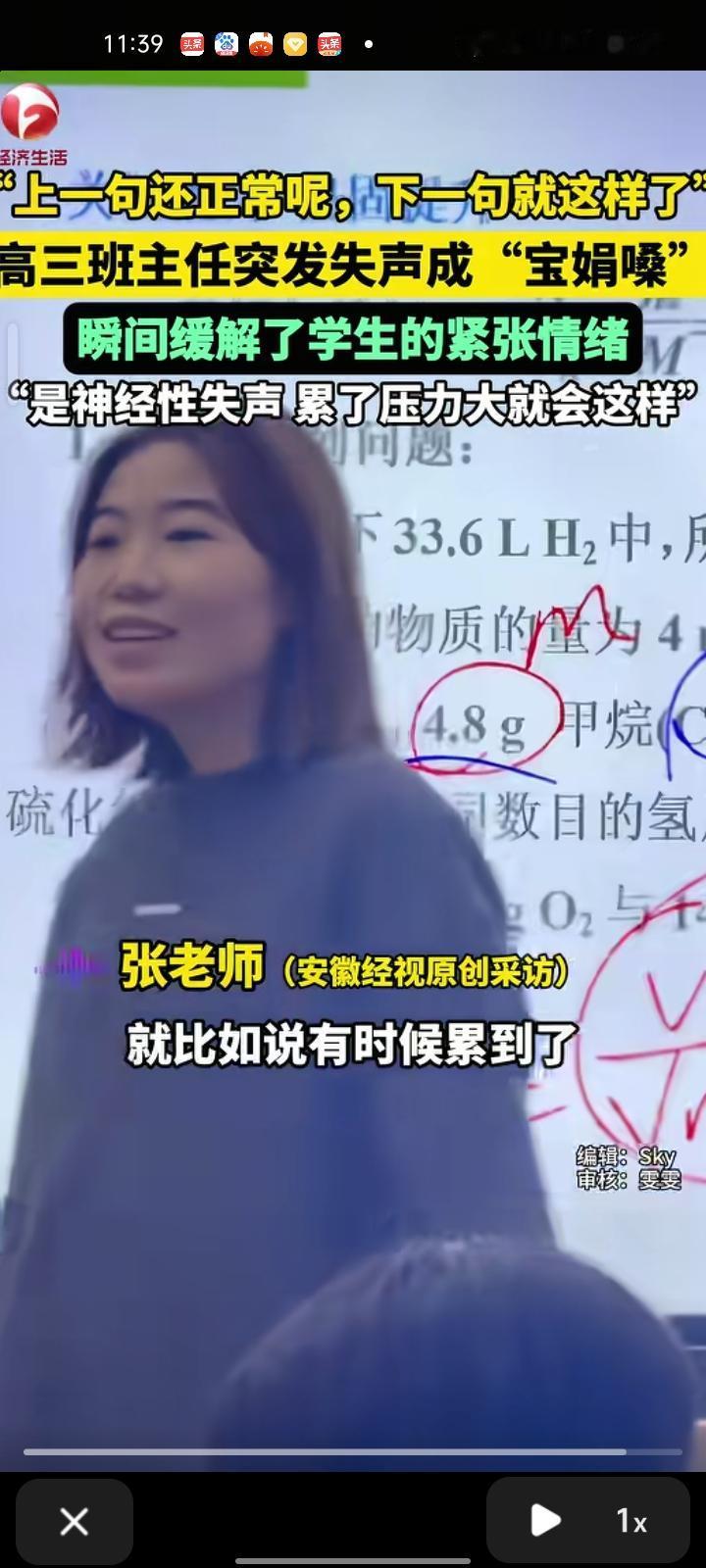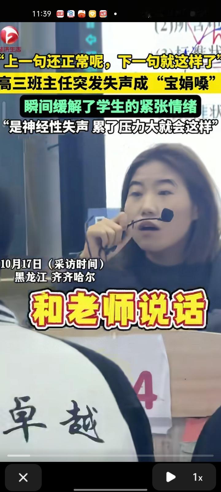 10月15日,黑龙江齐齐哈尔。高三班主任讲话突然失声变成“宝娟嗓”,学生们听了这个声音比较搞笑,一瞬间压力都没了。张老师解释称,是神经性失声,累了压力大引起。