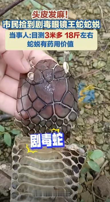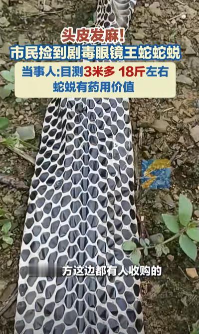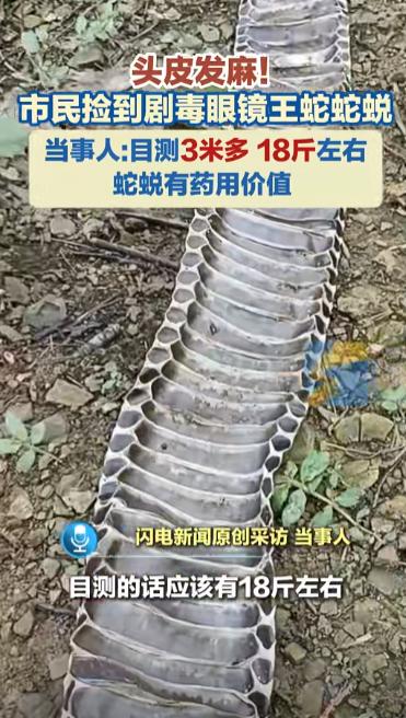 “这简直是捡钱啊!”10月15日,广西来宾,一男子捡到一条3米多的巨型眼镜王蛇蛇蜕,比小臂还粗,他目测约有18斤,这条蛇蜕比较完整,估计能卖不少钱,网友:这也太吓人了!   张大哥(化名)闲着没事于是就开车去了山区,然而就在他在山区行走时,发现地上有一条黑白相间的长条状物,他起初以为是被丢弃的塑料袋,但走近一摸,发现质地坚韧,像皮革一样有弹性,这才确认自己捡到的不是垃圾,而是一张蛇蜕。   随后张大哥与自己的手臂对比了一下,发现比他的胳膊还要粗,而且拿起了估摸着蜕下这张皮的蛇体重大约十八斤左右,更让人吃惊的是,这张蛇蜕保存得很完整,没有明显破损,鳞片上的纹路清晰可见。看   随后张大哥很是兴奋,一边笑着一边说捡到宝了捡到宝了,蛇皮有很大的医用价值,像这次张大哥发现的,剧毒眼镜王蛇留下、品相极佳的蛇蜕,是市场上的热门货,行情好的时候每斤可以卖一百多块钱,因此,从经济角度来看,这张蛇蜕确实是一笔意外的收入。   事后这件事情被网友们刷到了之后,一些网友说,张大哥这次可比捡钱过瘾得多了,这一张蛇皮要是买了的话就能卖不少价钱,纷纷表示眼红了。   此外还有一些网友在下面说,他之前郊游的时候也遇见过类似的蛇皮,但是由于他实在是太害怕了,就没有上前去捡起来看,撒腿就跑了。   那么通过这件事情告诉我们,这张蛇蜕的价值不仅在于经济上的潜力,更重要的是警示意义,发现它时,正确做法不是立刻捡起,而是先停下,观察周围环境,确认安全后再处理。   从这张蛇蜕身上,我们可以看到三个信息,蛇在这里生活且体型巨大,它蜕皮的过程很讲究,找到完整的蜕皮很难,同时它提醒人类注意安全。在自然环境中,人类需要看到机会,也必须判断风险,把安全放在第一位。   对此,你还有什么看法呢? (信息来源 :闪电新闻 )
