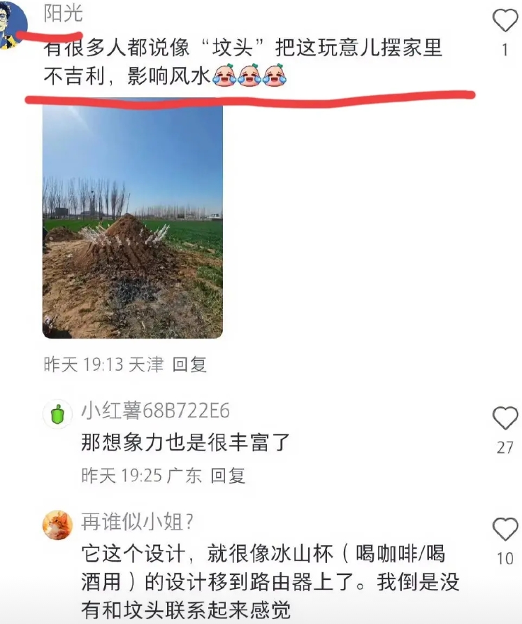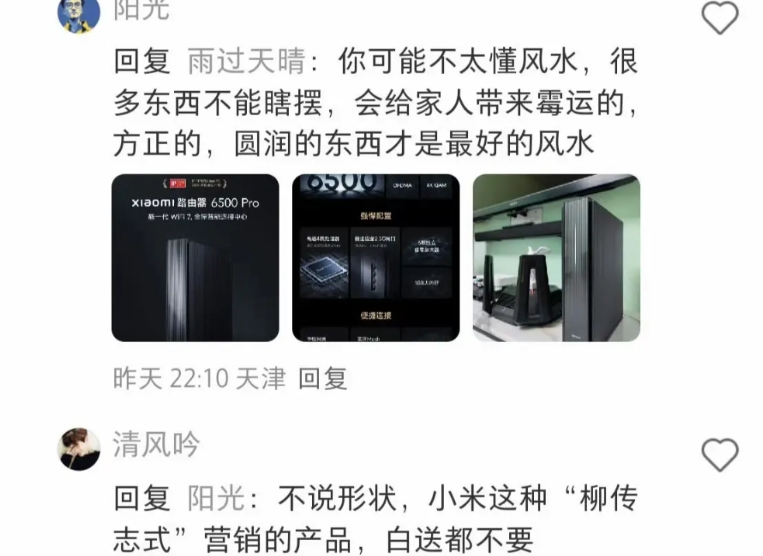 通过一件小小的路由器就能窥探出打击网络水军的必要性和难以根除的复杂性。华为余总预热的华为X3pro 极具艺术美学的一款路由器,居然被其他品牌粉丝说成能像极了“坟头”,还指出风水不好(图一),还指出方正圆润的造型才是好的风水并附上了他爱慕品牌的路由器造型(图二)。