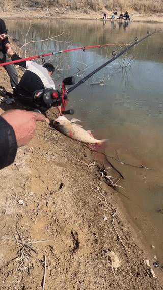 河北邢台钓友在一个野塘里意外钓到一条十几斤的大鲢鱼! 由于没有带抄网,为了能把大鱼拽上岸,只能让一个人拉着另一个人的手才能费力的将大鱼拽上来。钓鱼人有多执着