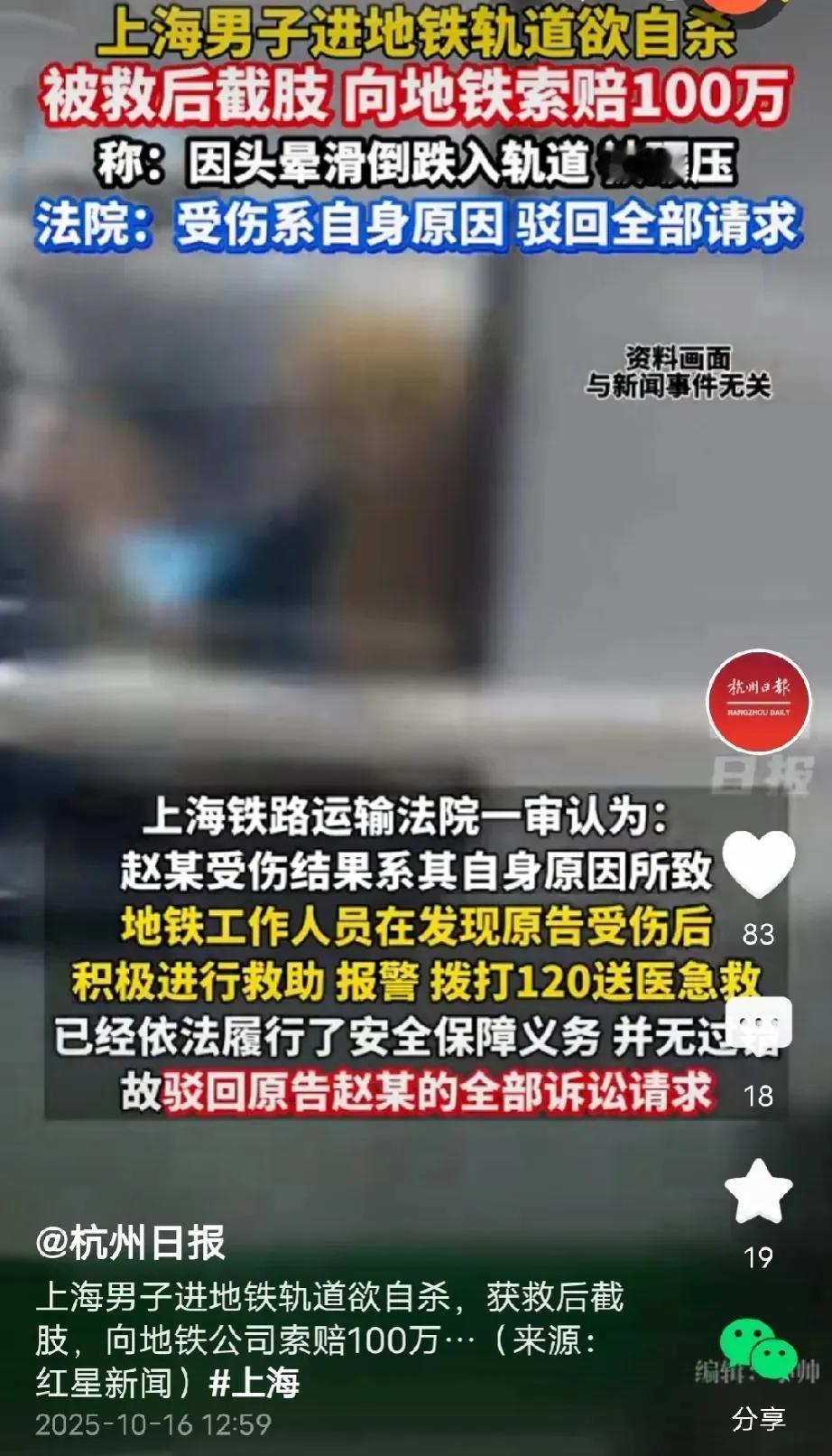 16日报道,上海58岁男子因工作不顺,偷偷翻入地铁轨道想要卧轨轻生,站务员发现后及时救下并送医,但男子还是因伤势过重导致右臂截肢,造成6级伤残。事后,男子把地铁公司告上法庭,他声称当时是因头晕不慎跌入地铁轨道,可站务员没做到及时发现并救助,这是他们工作上的失职,要求地铁公司赔偿100万余元。谁料,男子女婿的一个电话,让他的阴谋被揭穿,结局更是让他措手不及。 2024年3月的一个晚上,上海地铁3号线一列列车刚驶离站台,就有乘客向工作人员反映轨道上有人。 站务员立即按下紧急停车按钮并上报情况,五分钟内工作人员、民警和保安赶到现场,将伤者赵某从轨道区域抬出送医。 赵某当时58岁,右手前臂被列车碾压,经抢救后截肢,伤残鉴定为六级,几个月后,他将地铁公司告上法庭,索赔医疗费、残疾赔偿金等共计100多万元。 赵某在起诉状中称,自己当天在站台候车时突然头晕,不慎滑倒跌入轨道,他认为地铁公司未能及时发现并采取措施,导致他受伤,应承担赔偿责任。 庭审中,地铁公司提交了关键证据,事发当天民警的询问记录显示,赵某曾明确表示“不要救我”,并说“到火车站想卧轨自杀,没成功,就压到手”,这份笔录有赵某本人的签字确认。 更重要的证据来自赵某女婿的报警记录,事发当天下午,女婿曾报警称赵某失联,并告知民警赵某因工作不顺有焦虑症,近期有轻生念头,这通报警电话发生在事故之前。 地铁公司还指出了几个疑点,车站站台设有1.5米高的安全隔离设施,赵某身高约1.6米,如果只是头晕摔倒,很难越过这个高度的栏杆,而且医院的就医记录显示,赵某除了右上肢外伤,身体其他部位没有任何损伤。 如果真是因为头晕跌落,应该会有多处擦伤或撞伤,但实际情况是赵某只有手臂受伤,这更符合他主动进入轨道后躺下的情况,法院综合这些证据认为,赵某受伤是其自身故意行为造成的。 “这真是现实版“农夫与蛇”啊!自己想不开,地铁工作人员拼命救他,最后反倒被讹100万?法院判得没毛病,地铁公司又是紧急停车又是送医,连断臂都帮忙送到医院,还要咋样?要是这种索赔都能赢,以后谁还敢救人?” “看完背后发凉……法院为啥不支持赔偿?原来《民法典》第1174条写得很清楚:受害人故意造成的损害,别人不担责!赵大叔自己翻越1.5米高的安全门,还和民警说“别救我”,这明明是故意行为,法律不可能纵容“谁惨谁有理”。” “作为天天坐3号线的打工人,真心疼地铁员工!站台屏蔽门本来就是为了安全设计的,1.6米身高能“头晕跌进去”?这借口太离谱了!而且法院查了就医记录,只有手臂伤,其他部位没事,要是真晕倒摔下去,怎么可能只伤胳膊?” “赵大叔工作压力大值得同情,但自杀未遂后反咬救命恩人,心理可能已经扭曲了,其实家人早就报警说他焦虑、有轻生念头,这类情况更需要专业心理干预,而不是讹钱。” “希望社会多关注中年人心理健康,别让悲剧升级成闹剧。” “某些人别拿“弱势群体”说事!法院证据链多扎实:女婿报警记录、民警现场录音、医疗报告,连安全门高度都测量了,地铁公司要是赔了钱,岂不是鼓励更多人“碰瓷”公共设施?支持判决,不能让守法者寒心!” “哎,赵大叔也是可怜人,但可怜不是讹诈的理由,地铁员工救人是本职,但不是背锅侠!要是他胜诉了,以后地铁是不是得装10米高护栏?或者每节轨道配个保安?成本最后还是乘客买单啊。 如果你是法官,面对“自杀反索赔”的案件,会怎么平衡“同情弱者”和“司法公正”?说说你的理由! 信源:杭州日报