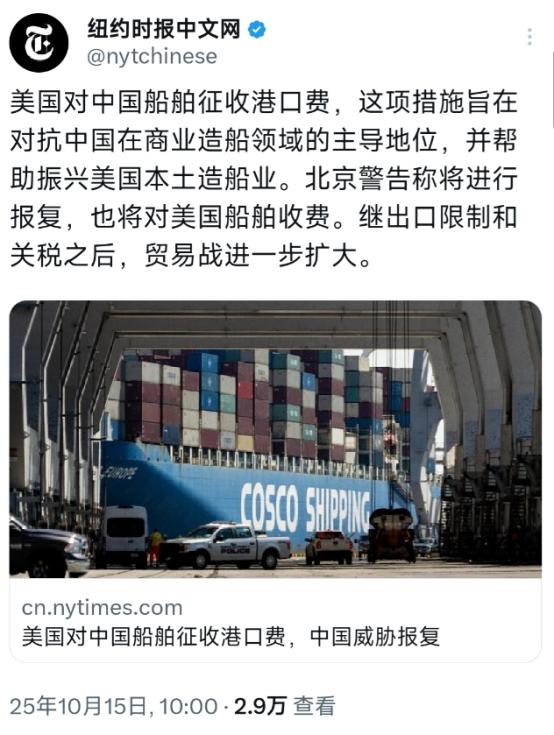 纽约时报中文网10月15日报道:“美国对中国船舶征收港口费,这项措施旨在对抗中国在商业造船领域的主导地位,并帮助振兴美国本土造船业。北京警告称将进行报复,也将对美国船舶收费。继出口限制和关税之后,贸易战进一步扩大。” 之前美国就搞过出口限制,芯片、半导体设备这些关键东西都不让卖给中国,后来又加关税,把中国不少商品的进口成本抬得老高。现在又盯上船舶港口费,很明显贸易战的圈子越扩越大,从高科技领域蔓延到了造船航运这块。 先说说中国造船业为啥能让美国这么紧张。这些年中国造船企业不管是技术还是产能都在飙升,全球每10艘商船里,差不多有6艘是中国造的。不管是大型集装箱船、油轮,还是专门运天然气的LNG船,中国船厂都能接,而且交货速度快、质量还过硬,价格比欧美船厂低不少,客户自然愿意找中国合作。 美国本土造船业早就没了当年的风光,工人老龄化严重,技术更新慢,造一艘船的成本比中国高30%还多,工期还能拖上一年半载。不少美国航运公司为了省钱,都跑去中国订船,这就让美国本土船厂更难混,只能靠政府补贴过日子。 美国这次搞港口费,就是想给中国船舶加负担,让中国造的船在美国港口停靠时成本变高,这样美国航运公司可能就会犹豫,转头去订美国本土造的船。 可他们没算明白,中国船舶在美国港口的业务只是一部分,中国造船业的客户遍布全球,欧洲、东南亚、中东的航运公司都是老客户,就算美国这边成本涨了,也影响不了中国造船业的整体盘子。 更关键的是,中国也有大量的港口,美国船舶来中国停靠的次数可不少。美国出口到中国的农产品、能源,还有不少工业产品,都得靠美国货轮运过来。中国要是对美国船舶征收港口费,美国航运公司的成本也得往上飙,最后这笔钱还得算在货物价格上,美国出口商和中国进口商都会受影响,甚至美国消费者买东西也得花更多钱。 之前美国加关税的时候就吃过这亏,不少美国零售商因为进口中国商品成本涨了,只能提高售价,最后是美国老百姓买单。现在又搞港口费,很可能重蹈覆辙。 再看航运业的连锁反应,全球航运线路都是串在一起的,中国和美国之间的航线更是重要通道。要是两边都加港口费,航运公司可能会调整线路,绕开对方港口,或者提高运费,这会让中美之间的贸易成本整体上升。 中国的制造业依赖原材料进口和产品出口,美国的农业和能源出口也依赖中国市场,航运成本涨了,两边的企业都会受挤压。比如美国农民本来就因为之前的关税,出口到中国的大豆、玉米少了不少,现在要是航运成本再涨,他们的利润空间就更小了。 美国政府可能觉得这招能帮本土造船业,可实际上美国造船业的问题不是靠加港口费就能解决的。美国本土船厂缺的是技术创新和产能提升,而不是靠打压竞争对手。就算中国船舶在美国港口成本高了,美国本土船厂也没法快速提升产能,满足市场需求,最后可能还是得靠进口外国船舶,只不过换成了韩国、日本的船厂,还是轮不到美国本土船厂。 中国这边的报复措施也不是随便说说,中国有上海港、宁波港、深圳港这些全球顶级的大港,美国船舶每年在这些港口停靠的次数超过5000次。中国要是加征港口费,美国航运公司每年得多花几亿美元,这笔钱可不是小数目。 而且中国还可以联合其他国家,一起应对美国的贸易保护主义。毕竟很多国家都受美国贸易政策的影响,比如之前美国对钢铁、铝加关税,就惹恼了欧盟、日本、韩国这些盟友。现在美国又对中国船舶下手,其他国家也可能担心自己的船舶行业会被盯上,说不定会跟中国站在一起,反对美国的单边措施。 贸易战从来没有赢家,之前美国加关税、搞出口限制,已经让中美两国的企业都蒙受了损失,现在又把船舶港口费扯进来,只会让双方的矛盾更激化。中国一直主张通过对话协商解决贸易问题,可美国总是搞单边主义,动不动就用制裁、加费的手段,这样下去只会让全球贸易秩序更混乱。 美国要是真为本土造船业着想,不如把精力放在投入研发、培养技术工人、降低造船成本上,而不是靠打压别人来给自己铺路。中国造船业的发展靠的是自身的努力和全球客户的认可,不是靠谁让出来的。美国想靠港口费挡住中国造船业,根本不现实,反而会让自己陷入更被动的局面。 现在双方都放出了狠话,接下来就看谁先迈出下一步。要是美国真的实施港口费,中国肯定会跟进报复,贸易战的火苗只会烧得更旺,最后受伤的还是中美两国的企业和老百姓,甚至会影响全球经济的复苏节奏。